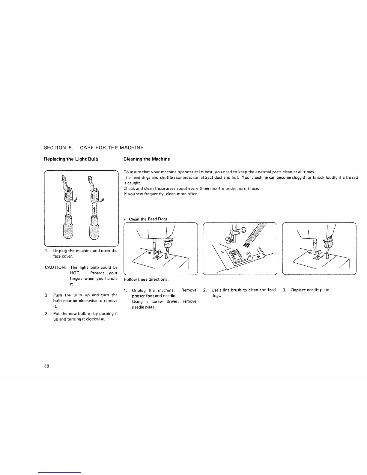 1. Unplug the machine. Remove 2. Use a lint brush to clean the feed 3. Replace needle plate.