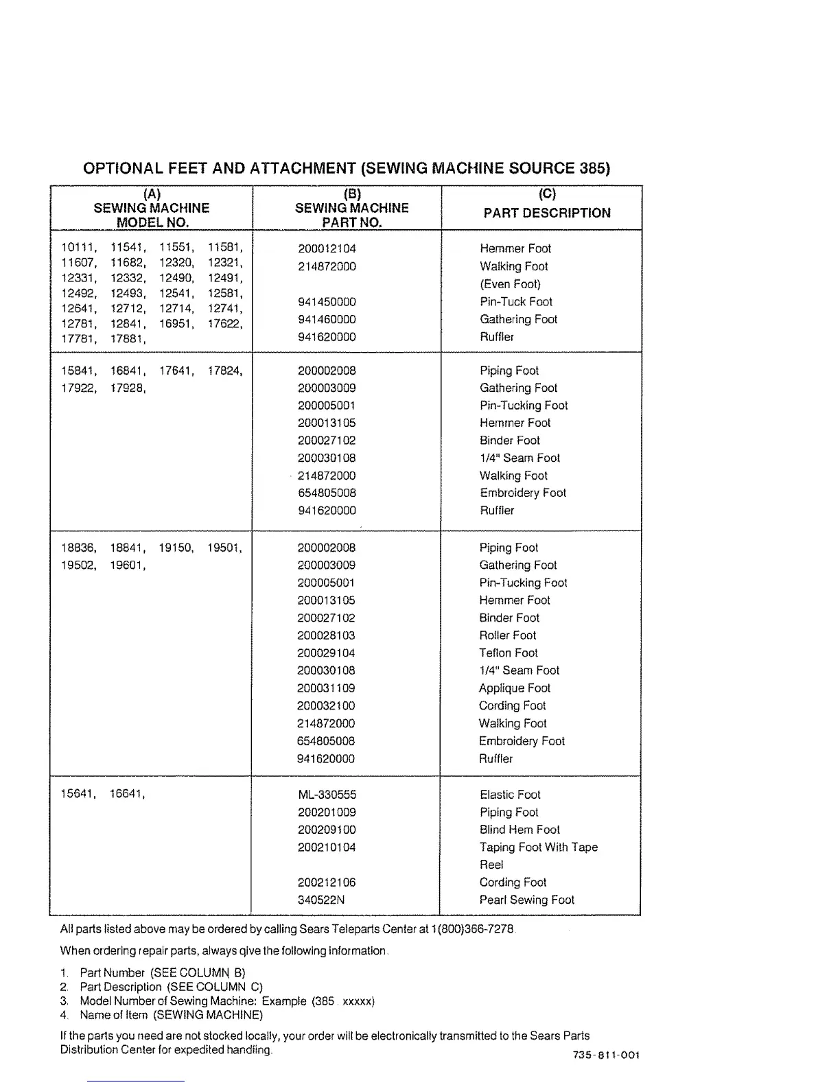 OPTIONAL FEET AND ATTACHMENT (SEWING MACHINE SOURCE 385)