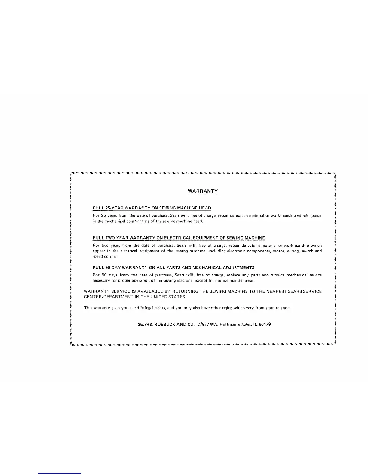 WARRANTY SERVICE IS AVAILABLE BY RETURNING THE SEWING MACHINE TO THE NEAREST SEARS SERVICE -_