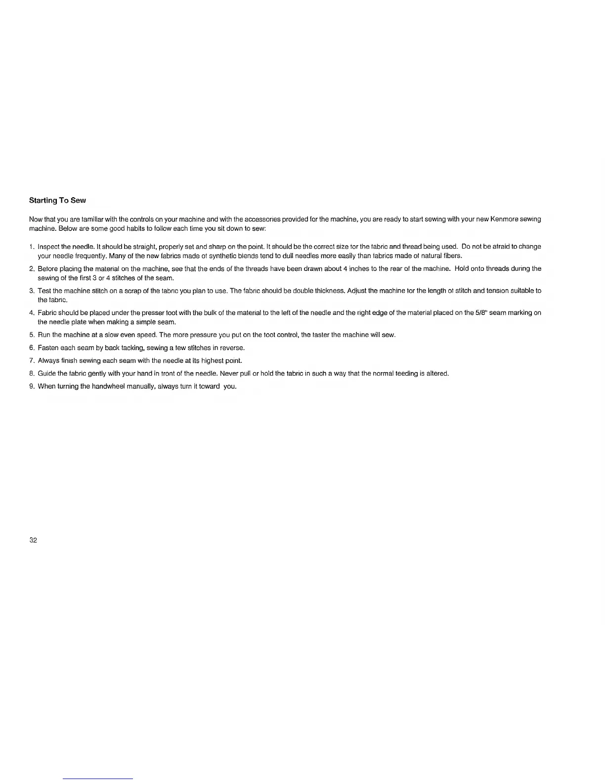 Now that you are familiar with the controls on your machine and with the accessories provided for the machine, you are ready to start sewing with your new Kenmore sewing
