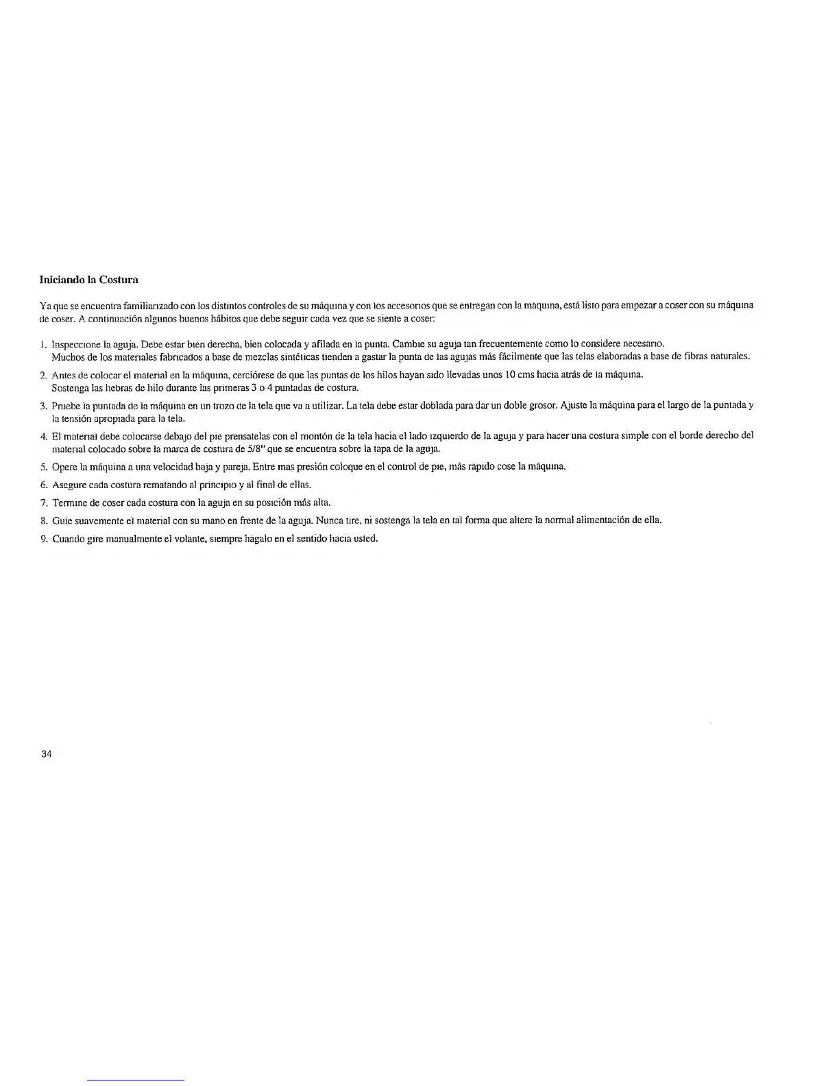 8. Guie suavemente et material con su mano en frente de la aguja. Nunca tire, ni sostenga la tela en tal forma que allere la normal alimentaci6n de ella.