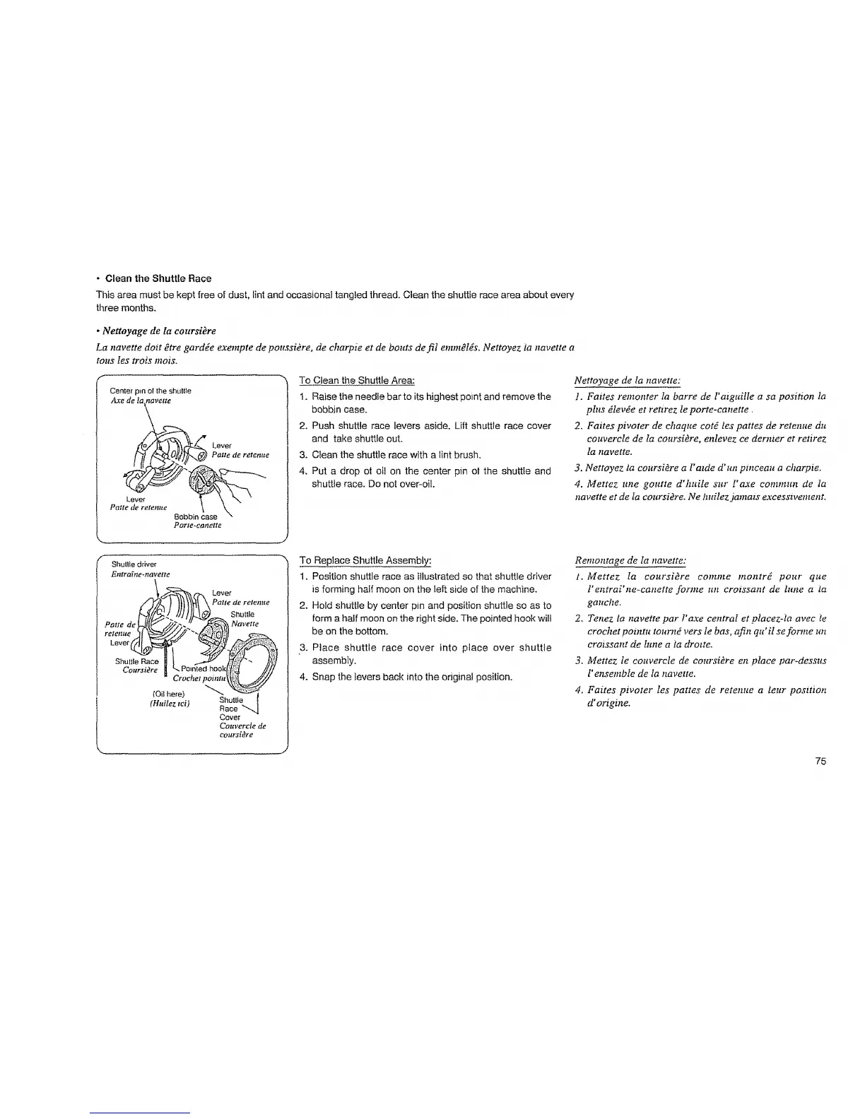 This area must be kept free of dust, lint and occasional tangled thread. Ctean the shuttle race area about every