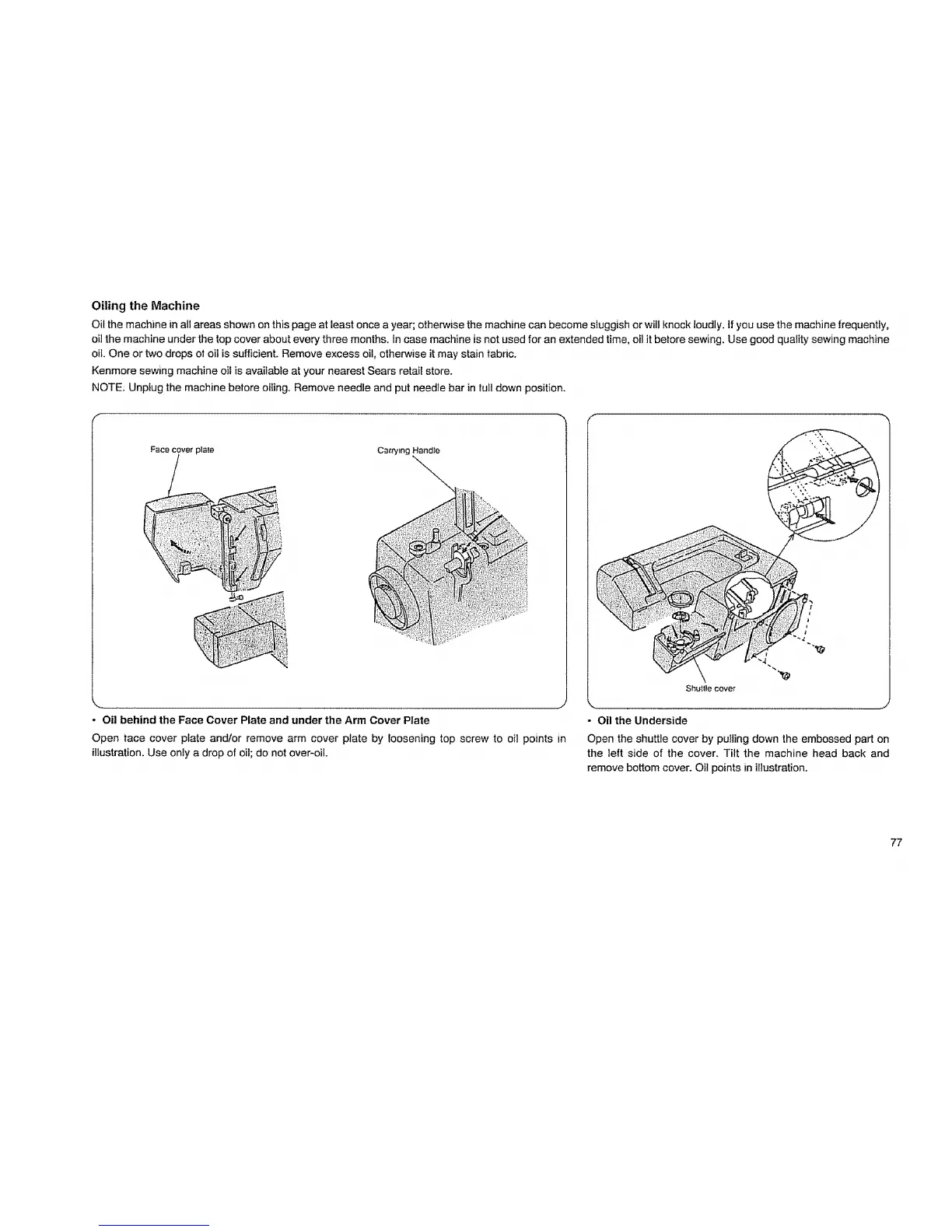 NOTE: Unplug the machine belore oiting. Remove needle and put needle bar in lull down position.