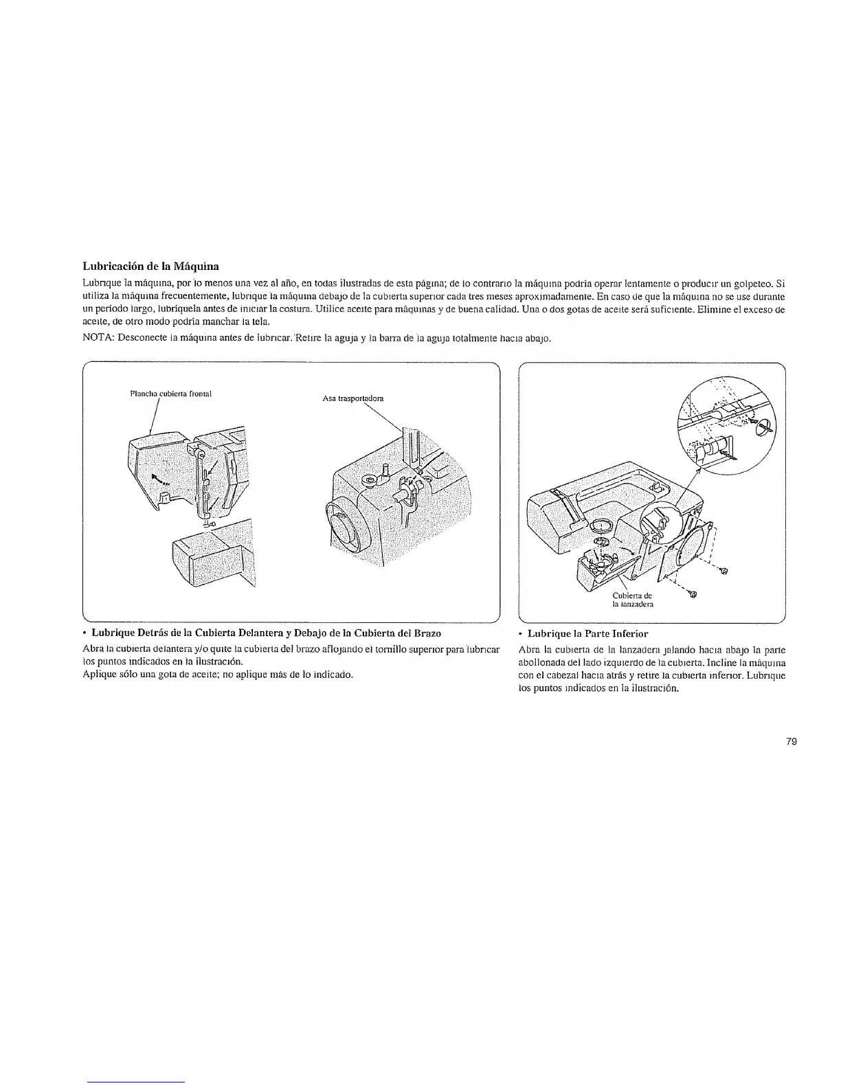 NOTA: Desconecte la mfiquina antes de tubricar.Retire la aguja y la batTa de ]a aguja totalmente tmcla abajo.