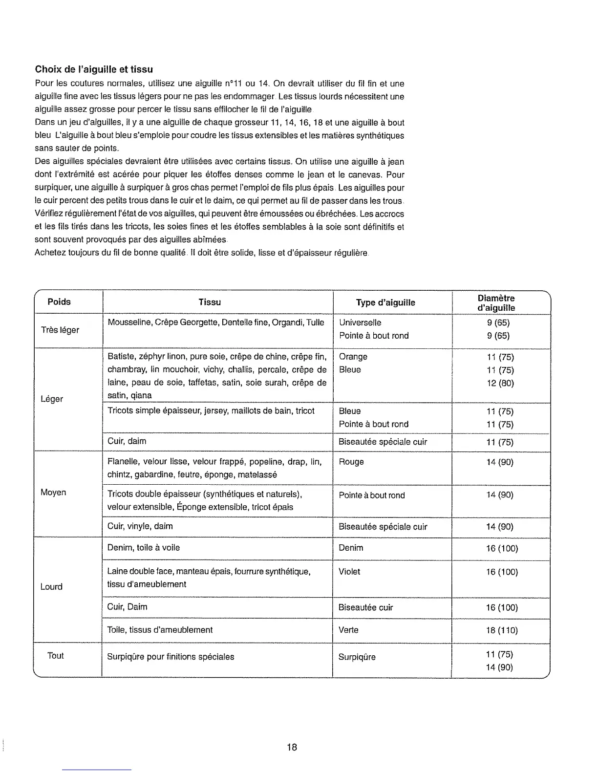 Pour fes coutures normales, utilisez une aigui!le n°11 ou 14, On devrait utiliser du fil fin et une