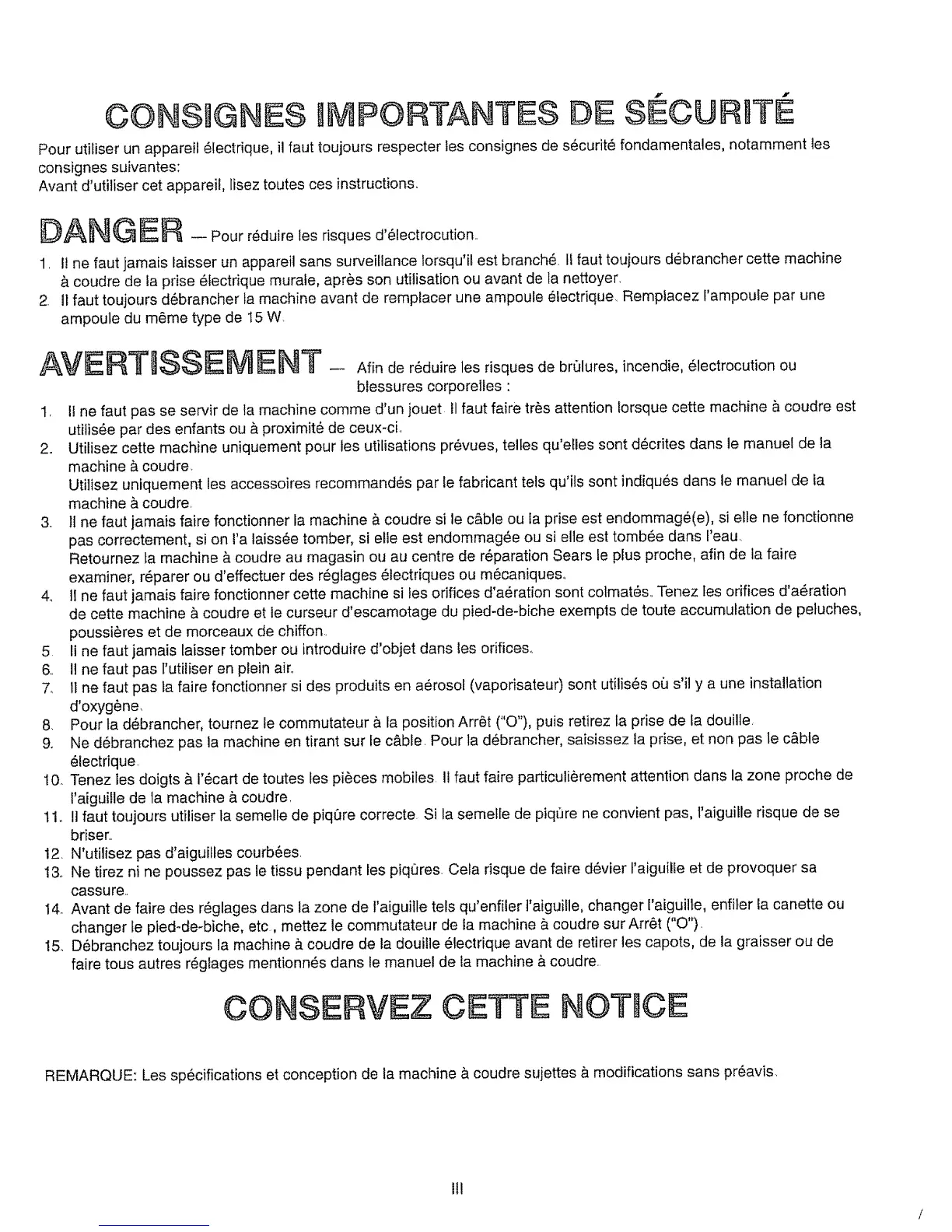 REMARQUE: Les specifications et conception de la machine & coudre sujettes & modifications sans pr6avis.