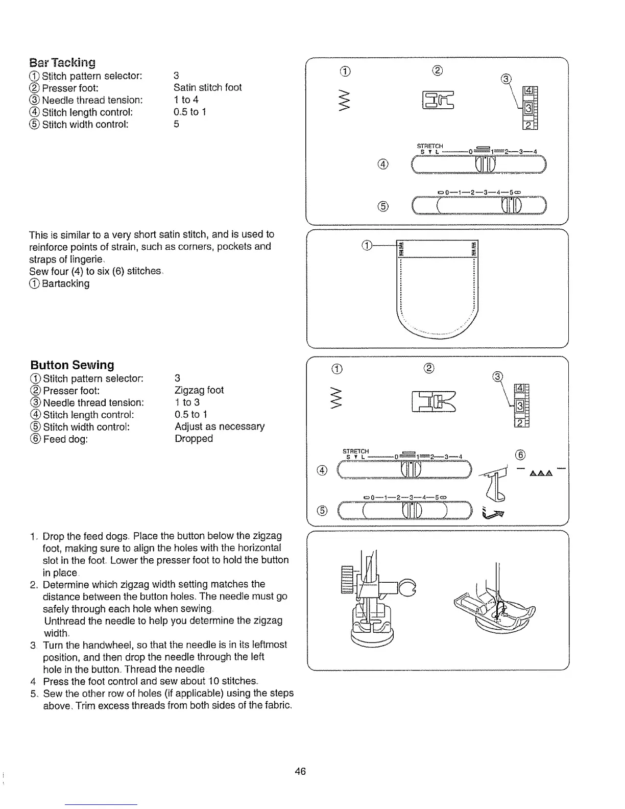 1o Drop the feed dogs, Place the button below the zigzag