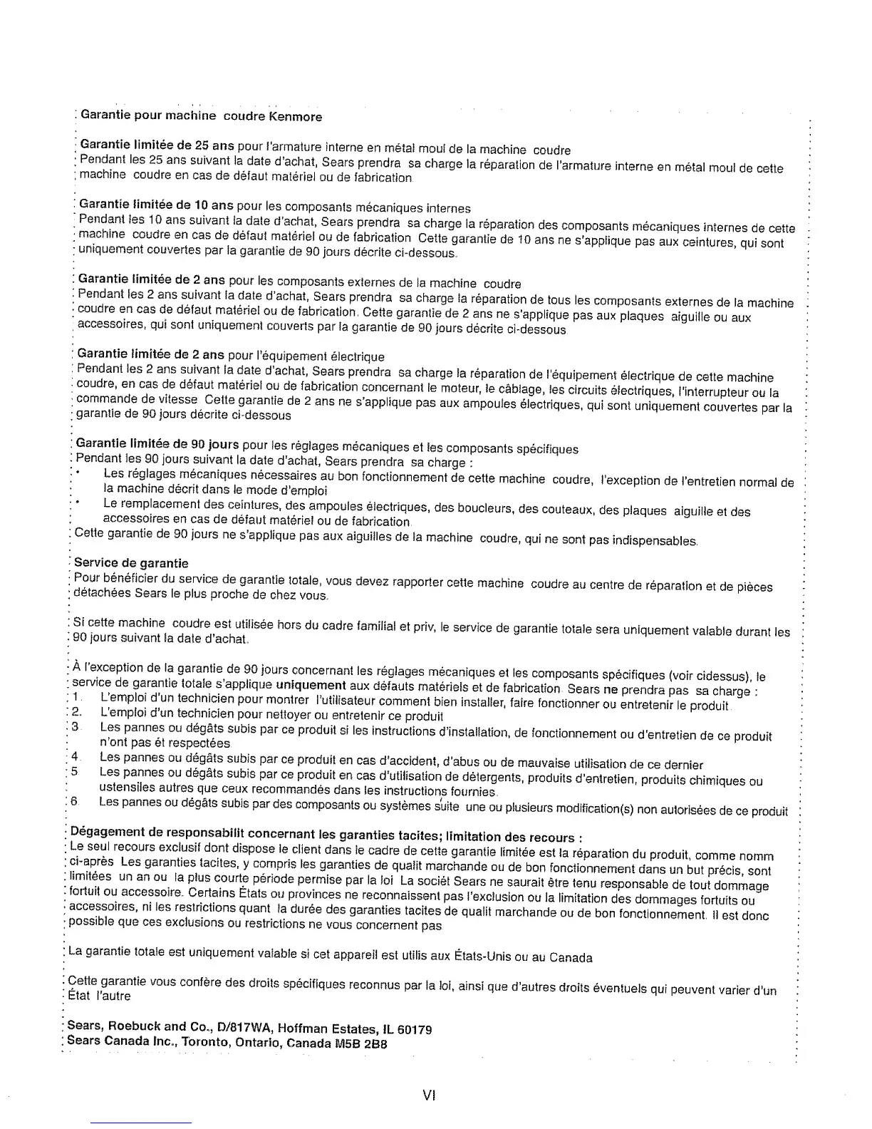 Pendant les 10 ans suivant ta date d'achat, Sears prendra sa charge ia r6paration des composants m6caniques internes de cette