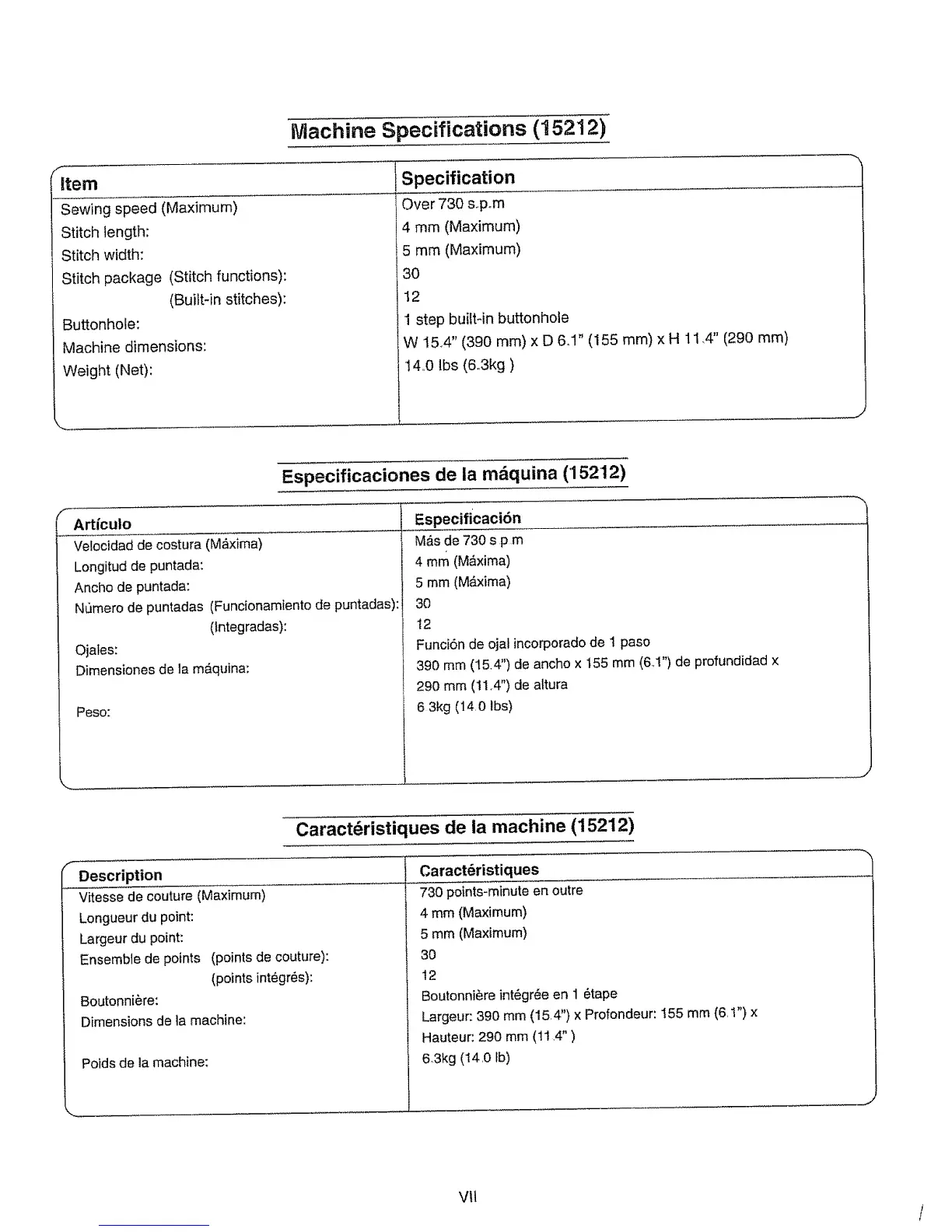 Machine Specifications (15212)