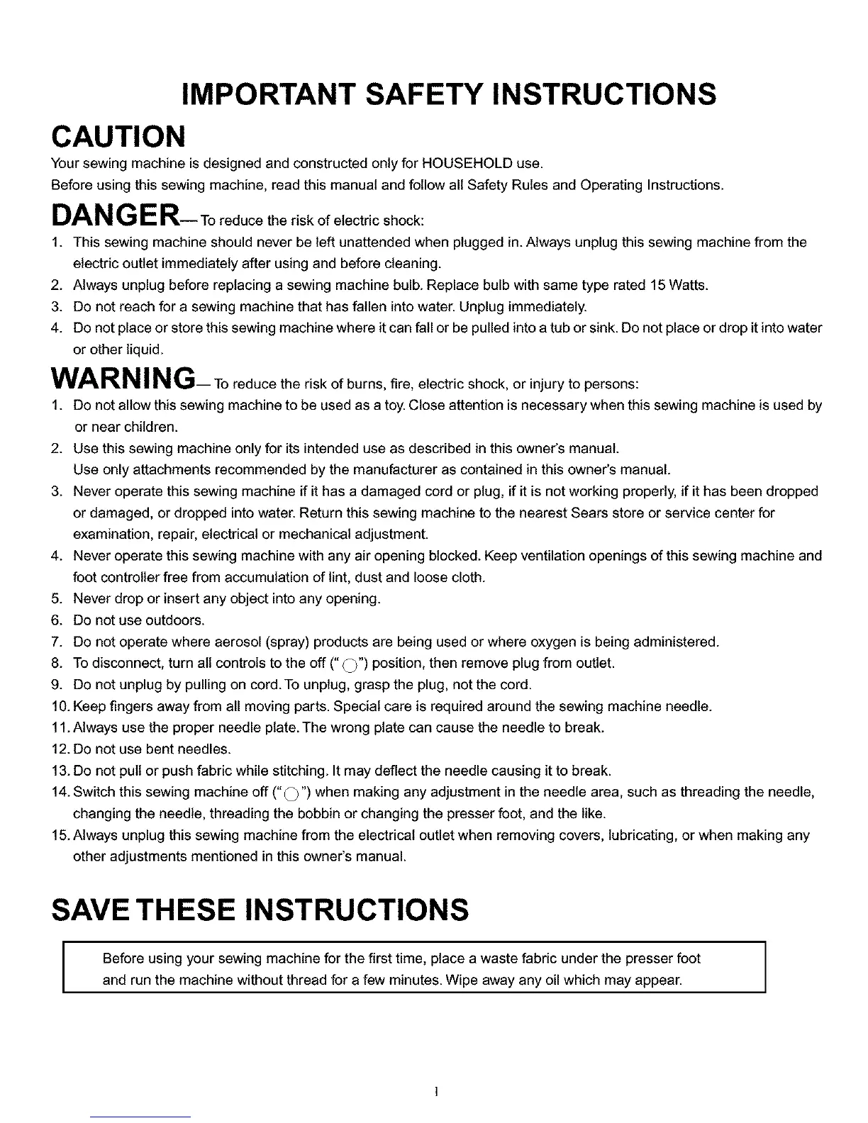 15. Always unplug this sewing machine from the electrical outlet when removing covers, lubricating, or when making any