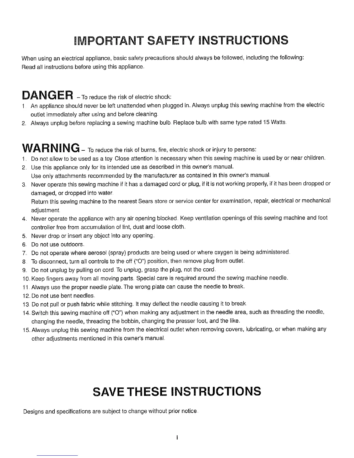 15. Always unplug this sewing machine from the electrical outlet when removing covers, lubricating, or when making any