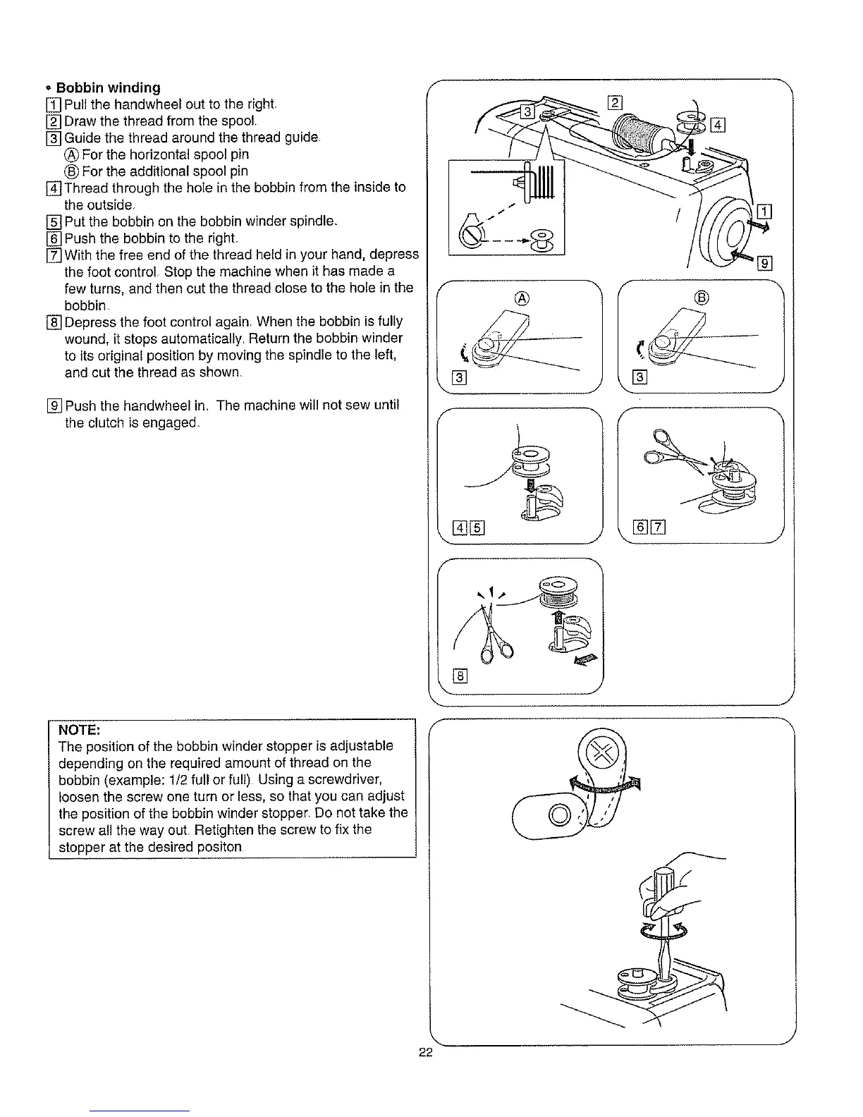 wound, it stops automatically, Return the bobbin winder