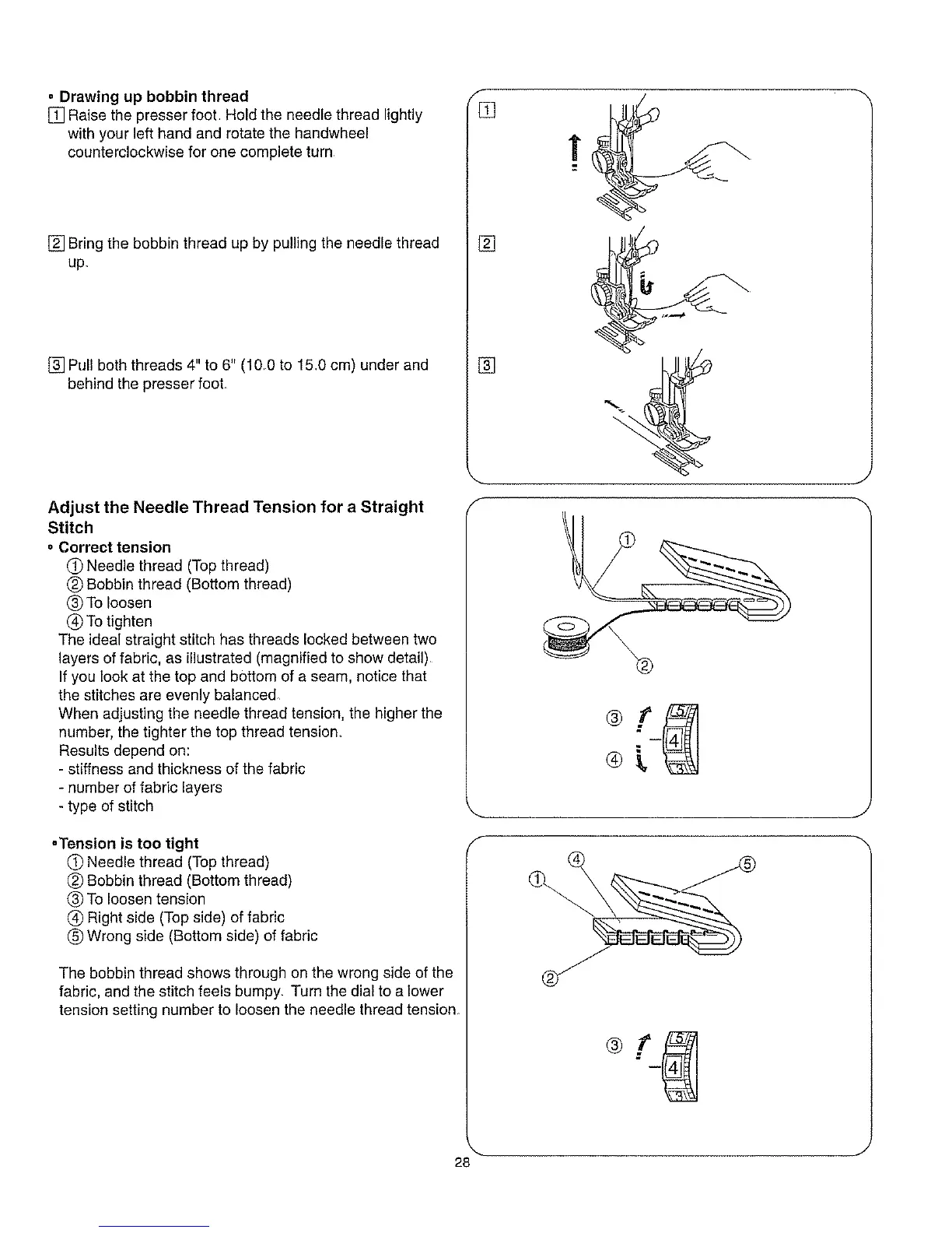 [] Bring the bobbin thread up by pulling the needle thread
