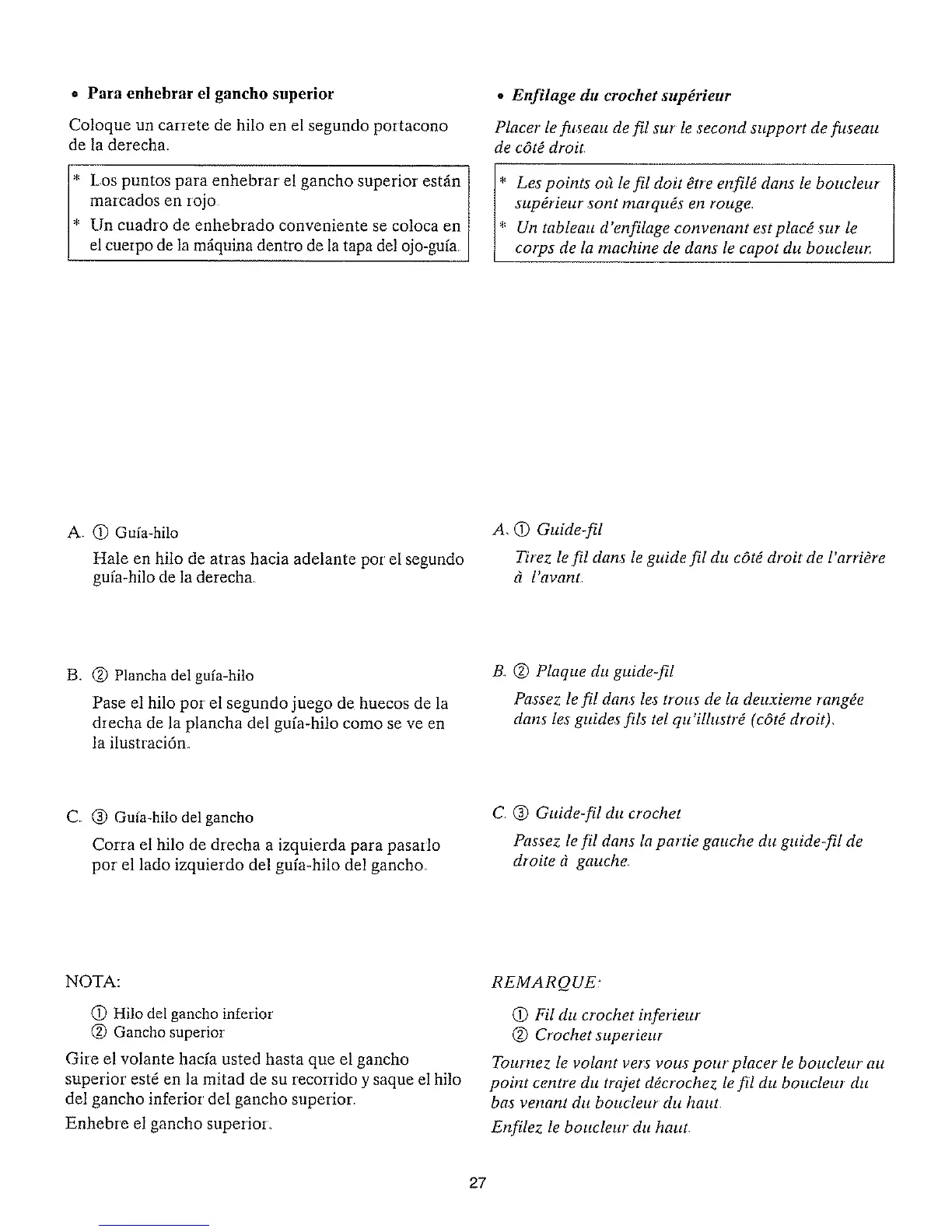 Hale en hilo de atras hacia adelante pot el segundo Tirez le fil dans le guide fil du c6tE droit de l'arriEre