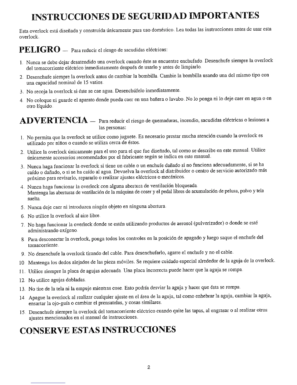 Esta overlock estfi disefiada y constmida finicamente para uso dom4stico. Lea todas las inst:ucciones antes de usar esta