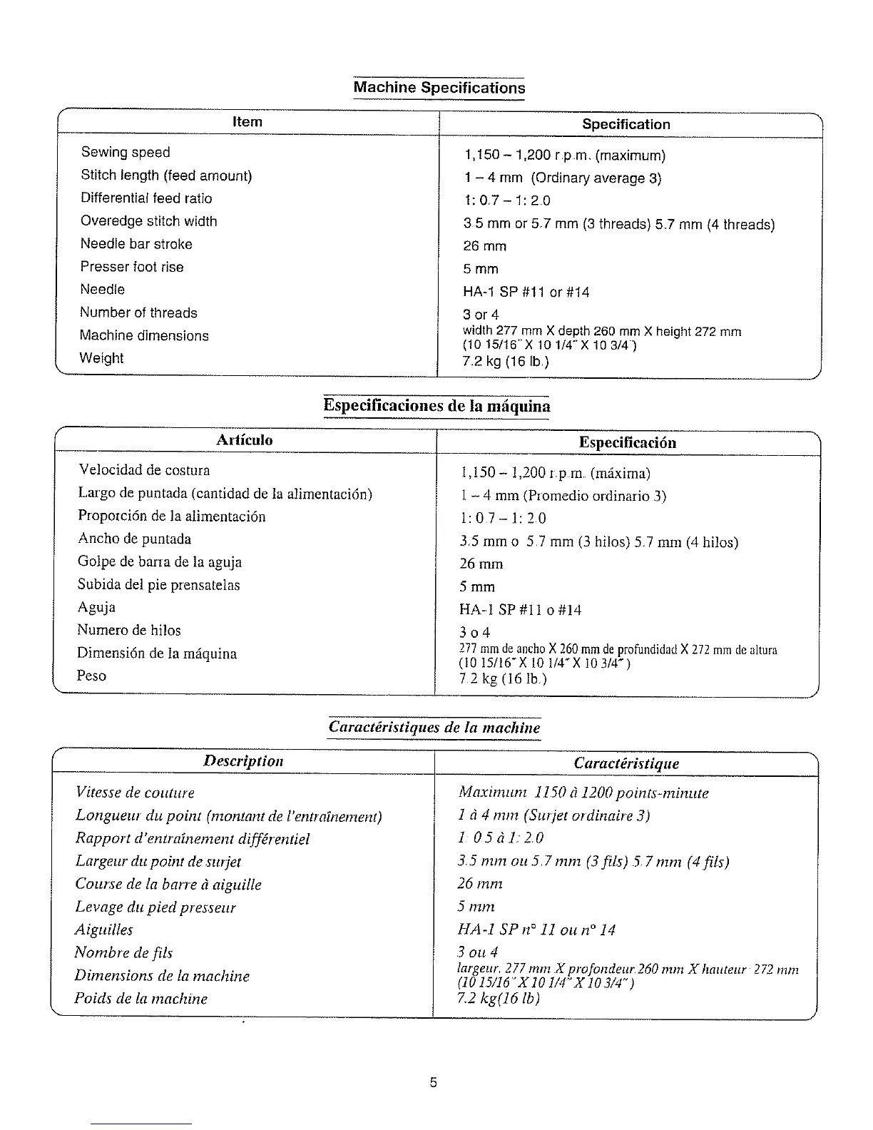 Especificaciones de la mdquina