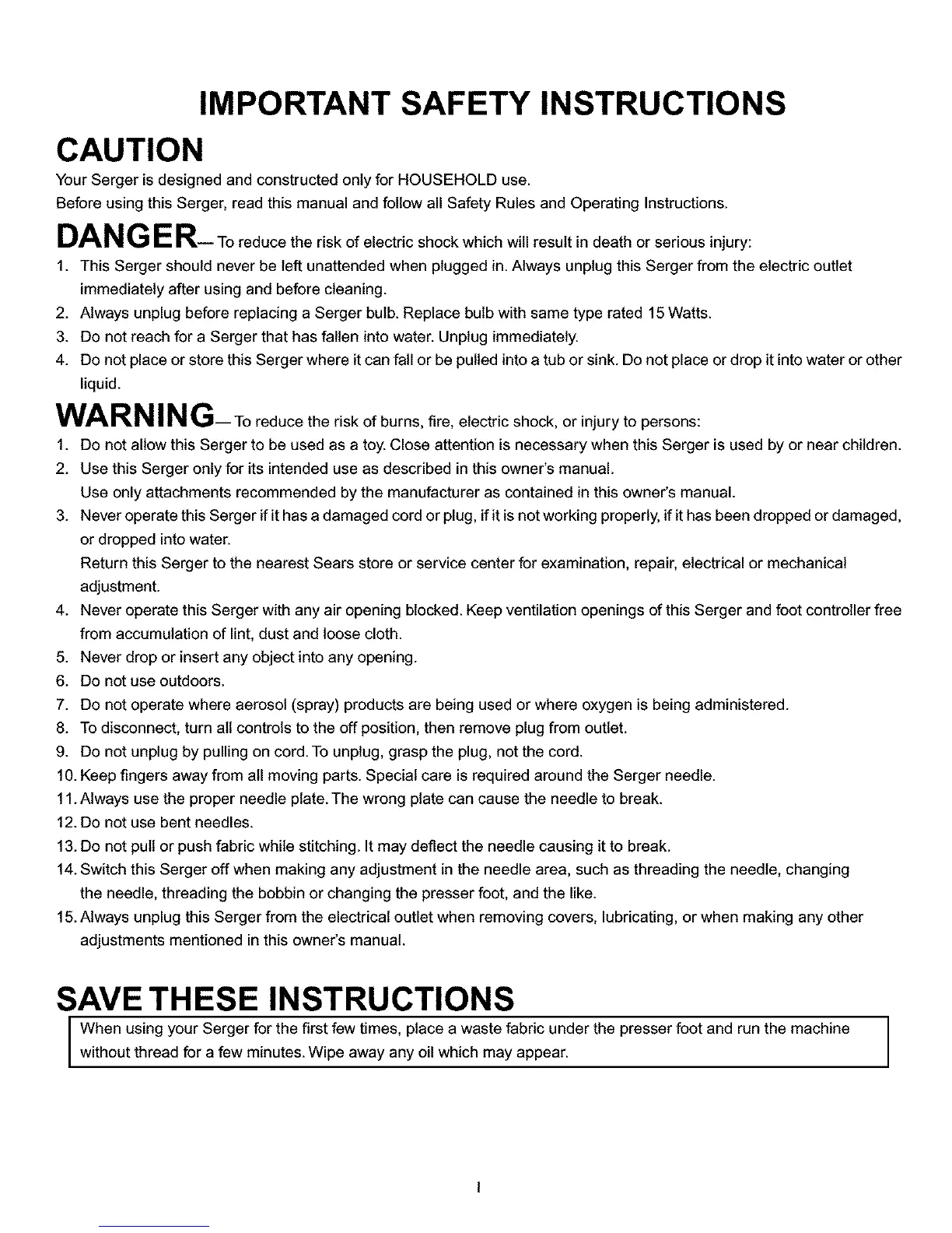 15. Always unplug this Serger from the electrical outlet when removing covers, lubricating, or when making any other