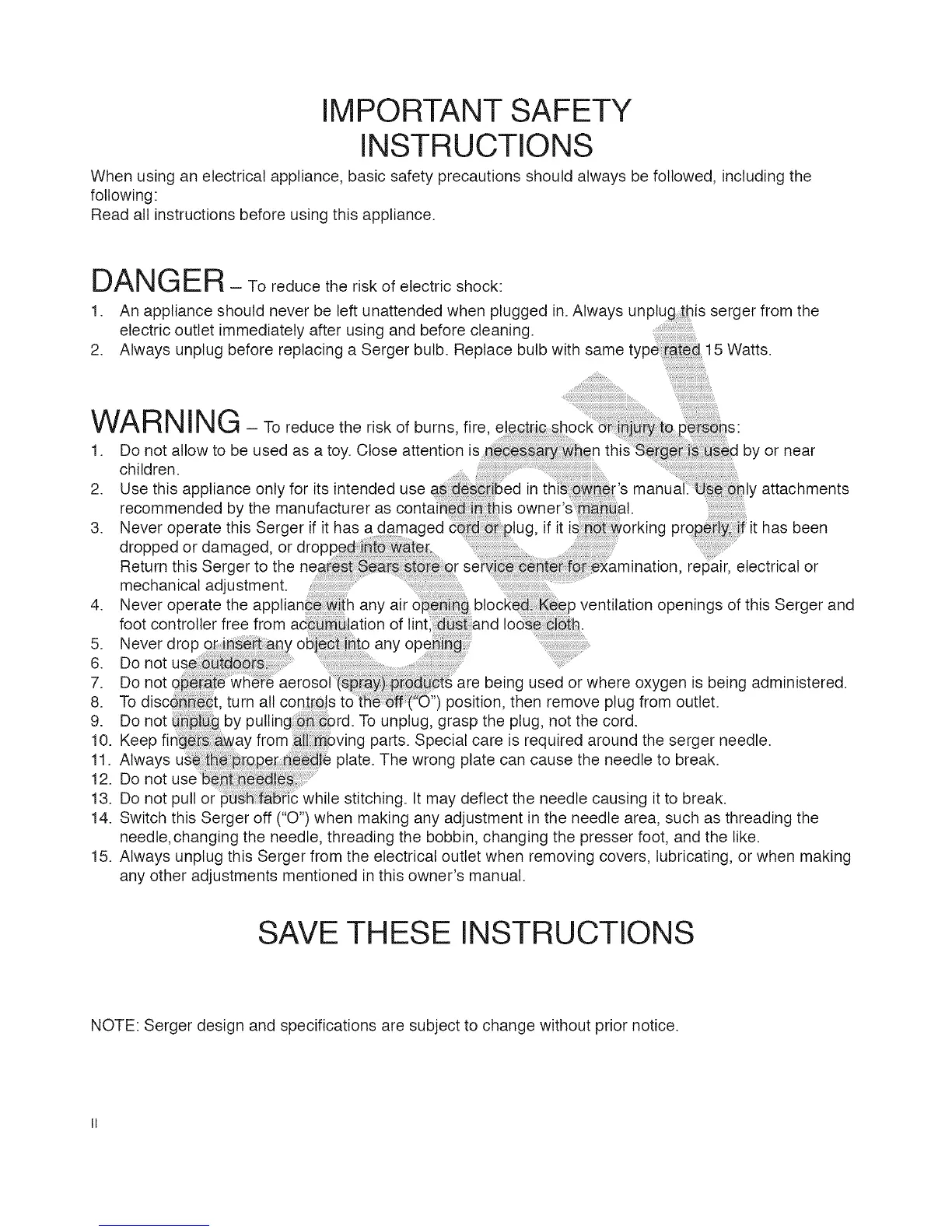 15. Always unplug this Serger from the electrical outlet when removing covers, lubricating, or when making