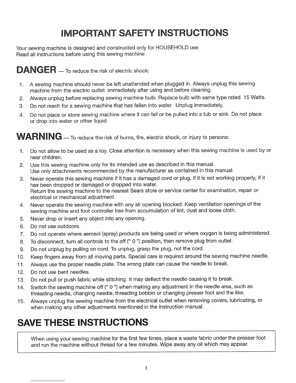 15. Always unplug the sewing machine from the electrical outlet when removing covers, lubricating, or
