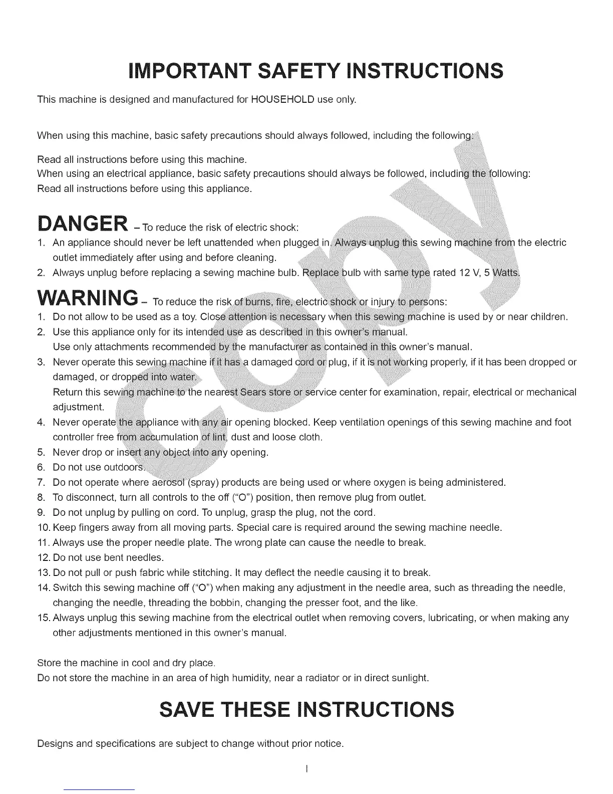 15.Always unplug this sewing machine from the electrical outlet when removing covers, lubricating, or when making any