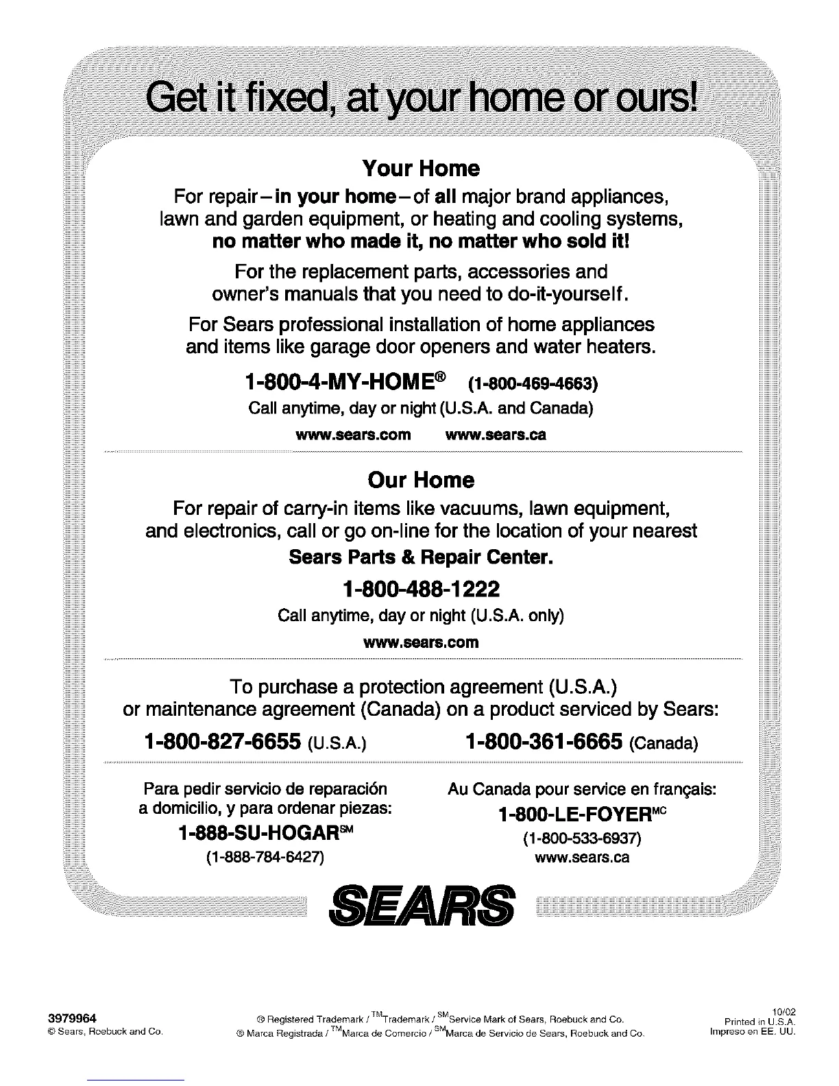3979964 ® Registered Trademark / Trademark / Service Mark of Sears, Roebuck and Co. Printed in U.S.A.