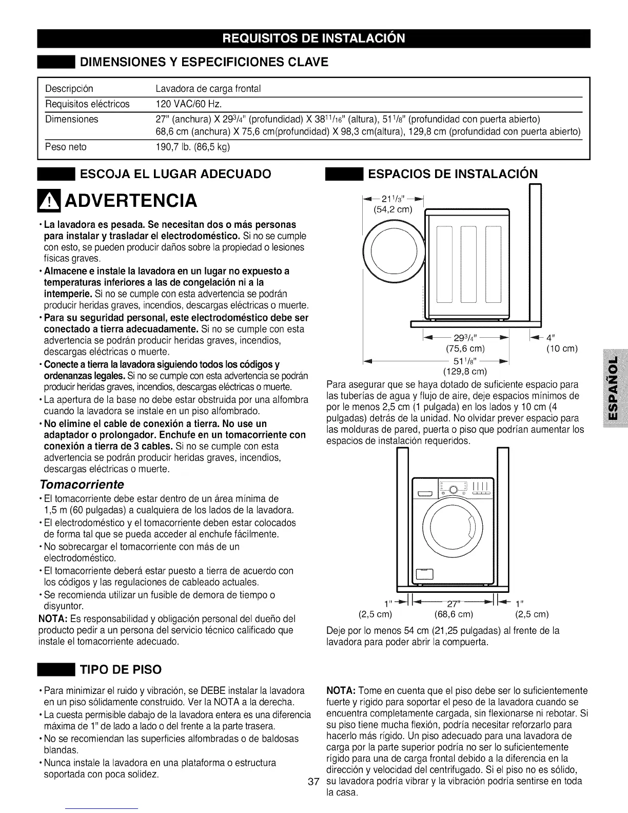 1,5 m (60 putgadas) a cuatquiera de los tados de la lavadora.