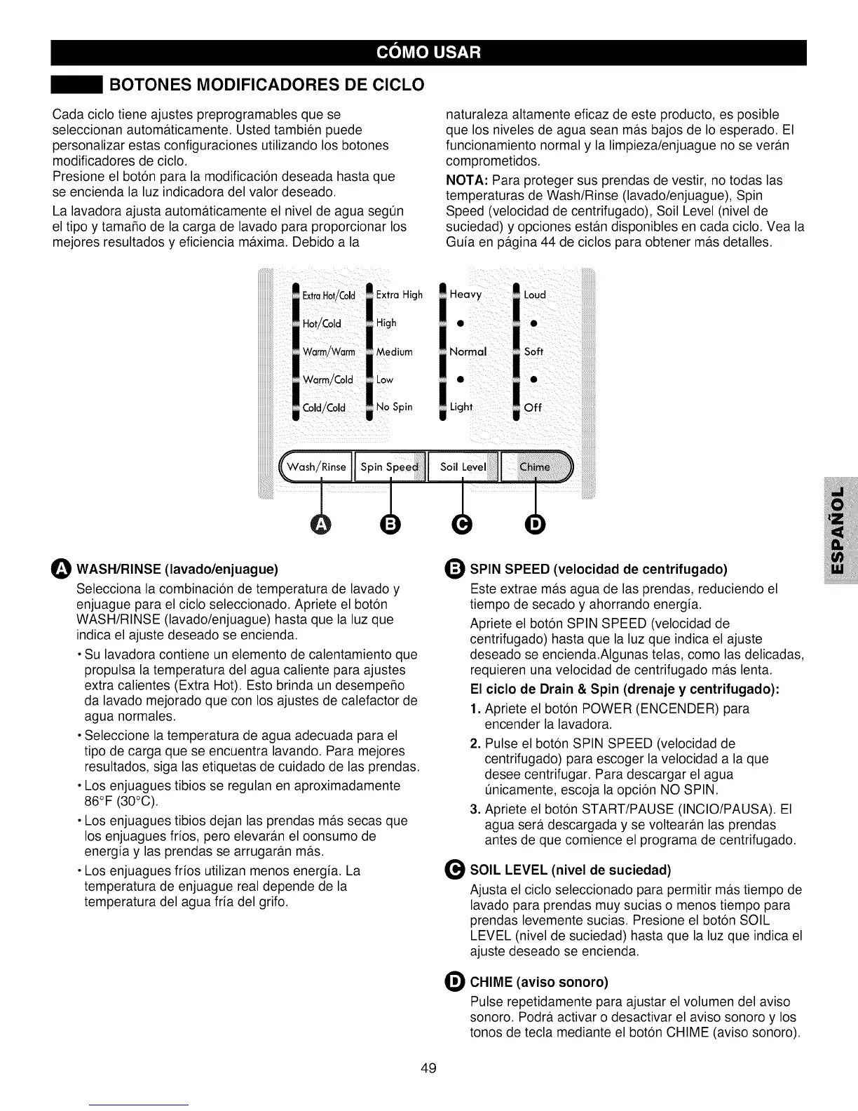 suciedad) y opciones esta.ndisponibles en cada ciclo. Vea la