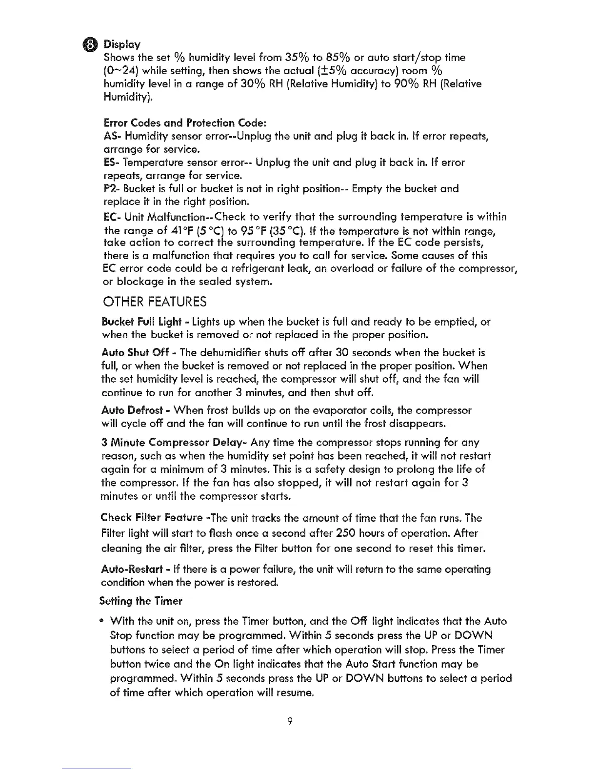 Auto Shut Off - The dehumidifier shuts off: after 30 seconds when the bucket is