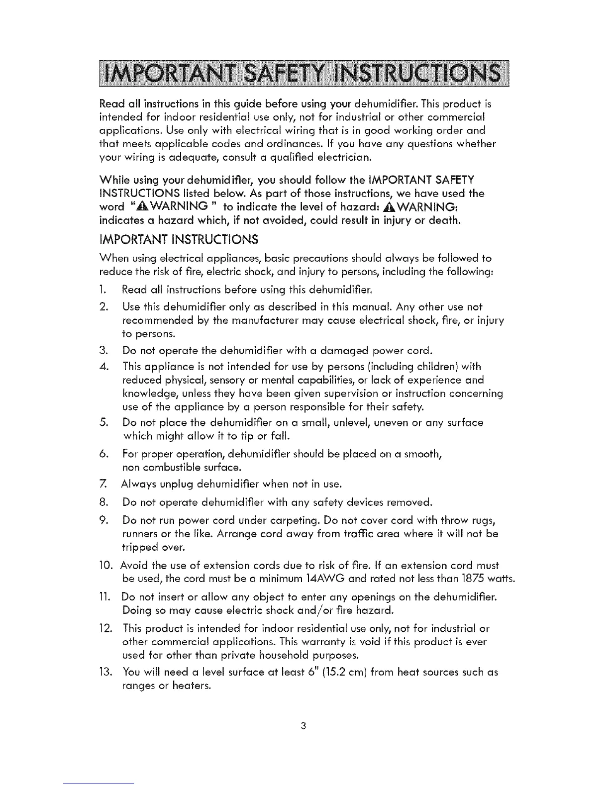 While using your dehumidifier, you should follow the IMPORTANT SAFETY