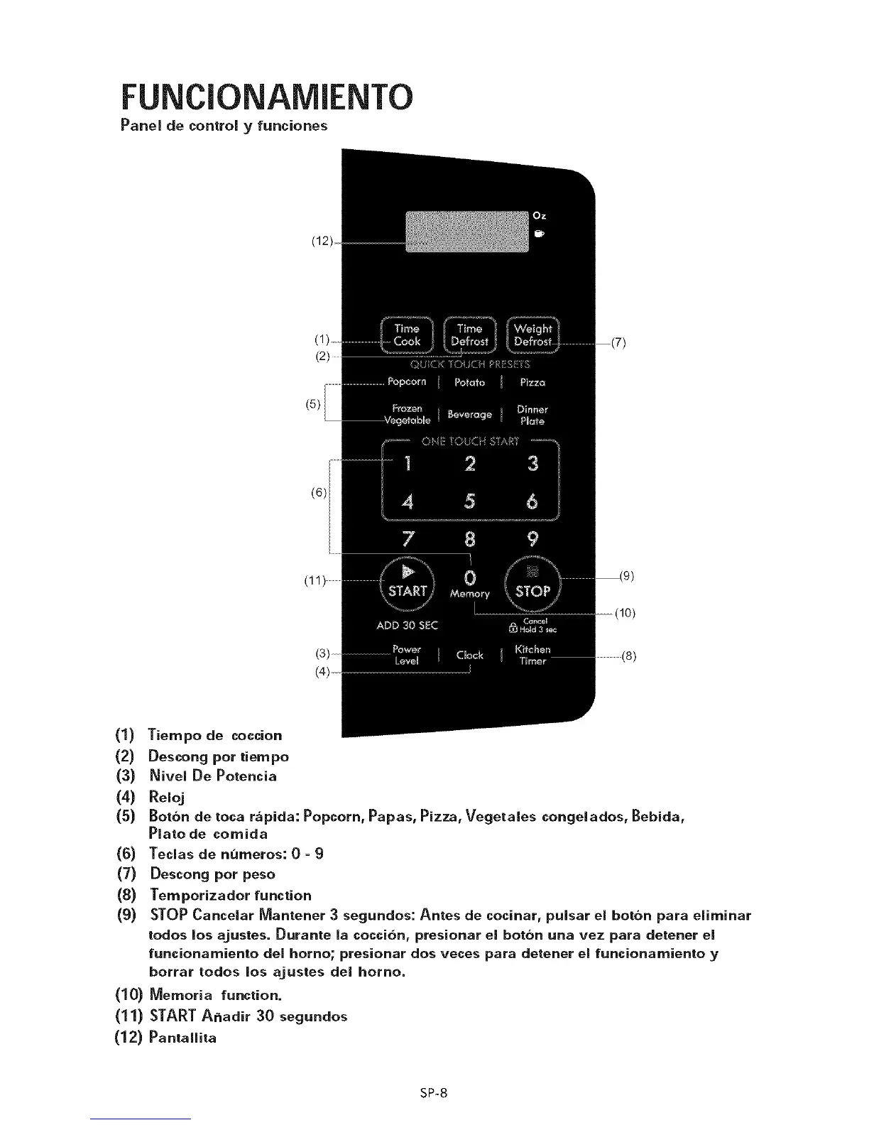 (9) STOP Cancelar Mantener 3 segundos: Antes de cocinar, pulsar el botbn para eliminar