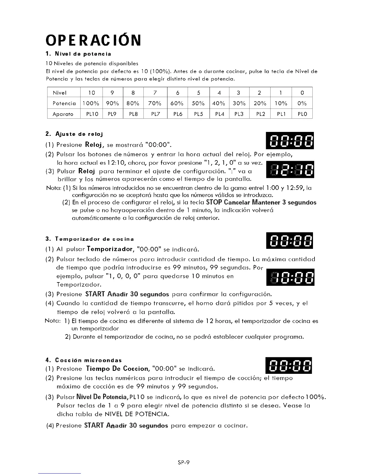 El nivel de potencia por defecto es 10 (100%). Antes de o durante cocinar, pulse la tecla de Nivel de