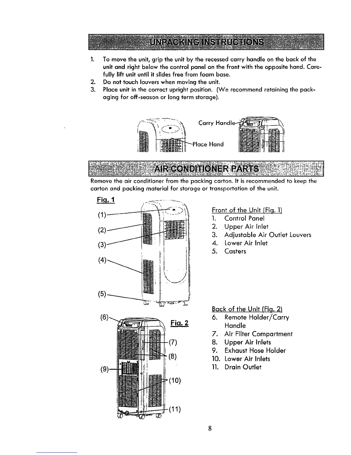 2. Do not touch louvers when moving the unit.