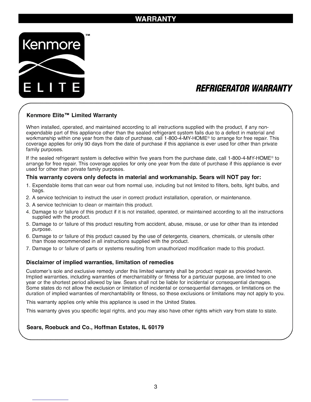 Kenmore Elite TM Limited Warranty