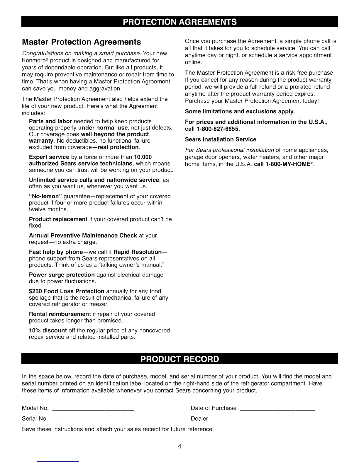 Kenmore 41002 - Protection Agreements and Product Record; Master Protection Agreements