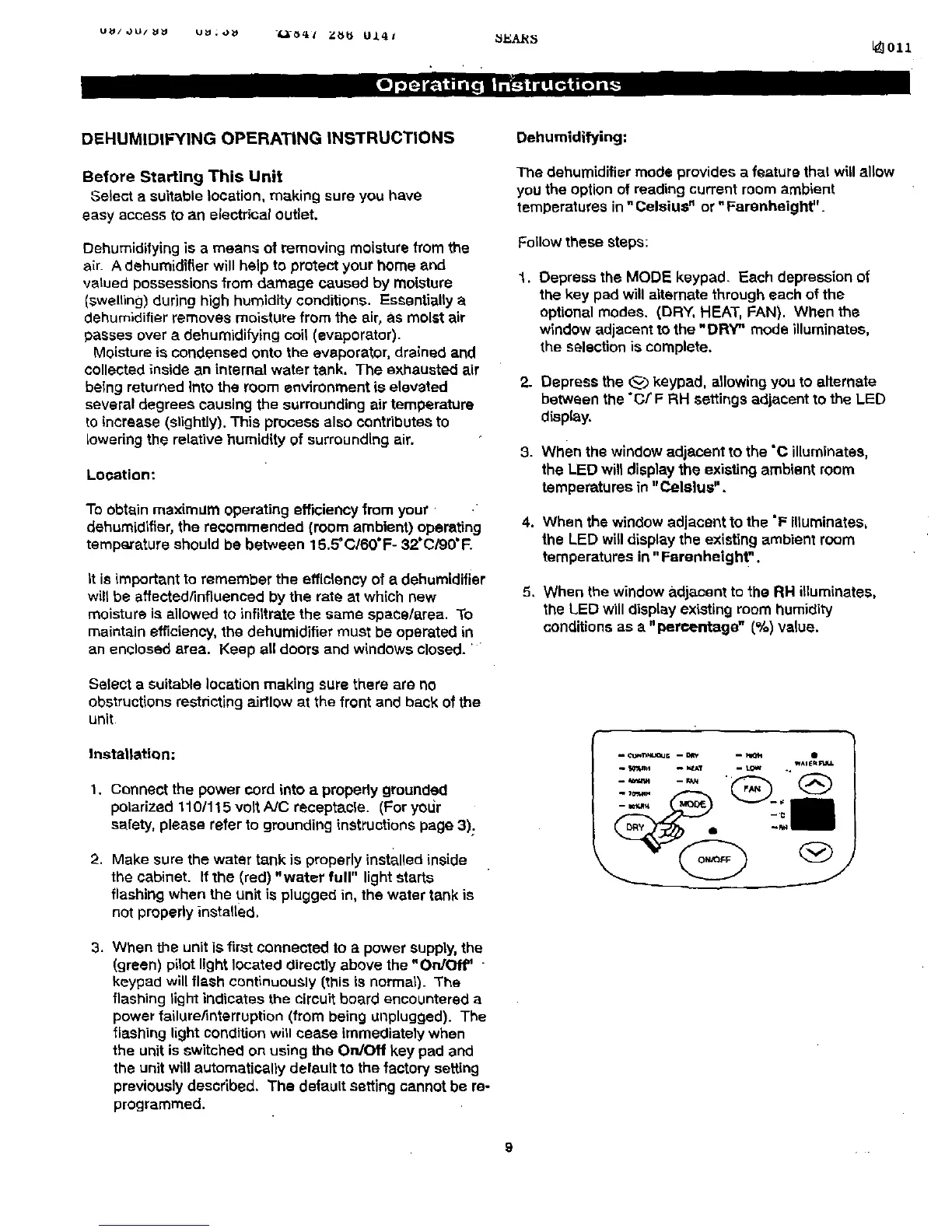 DEHUMIDIFYING OPERATING INSTRUCTIONS