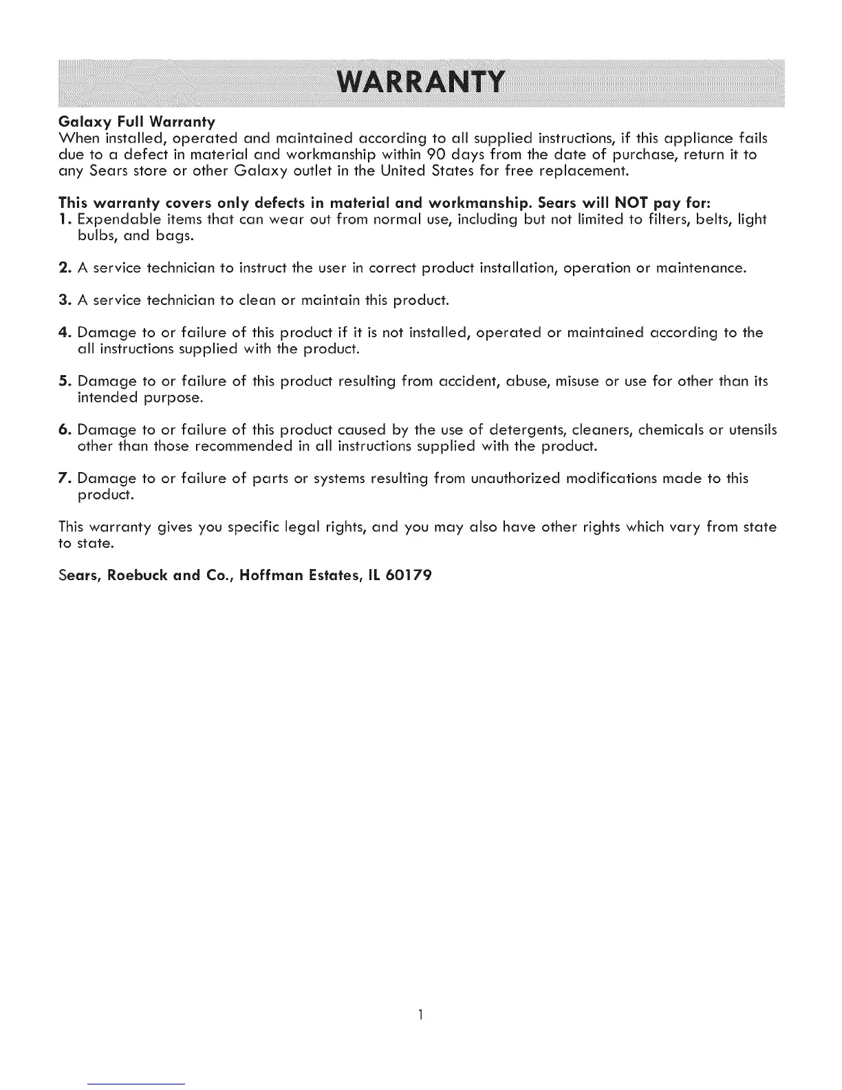 This warranty covers only defects in material and workmanship. Sears will NOT pay for: