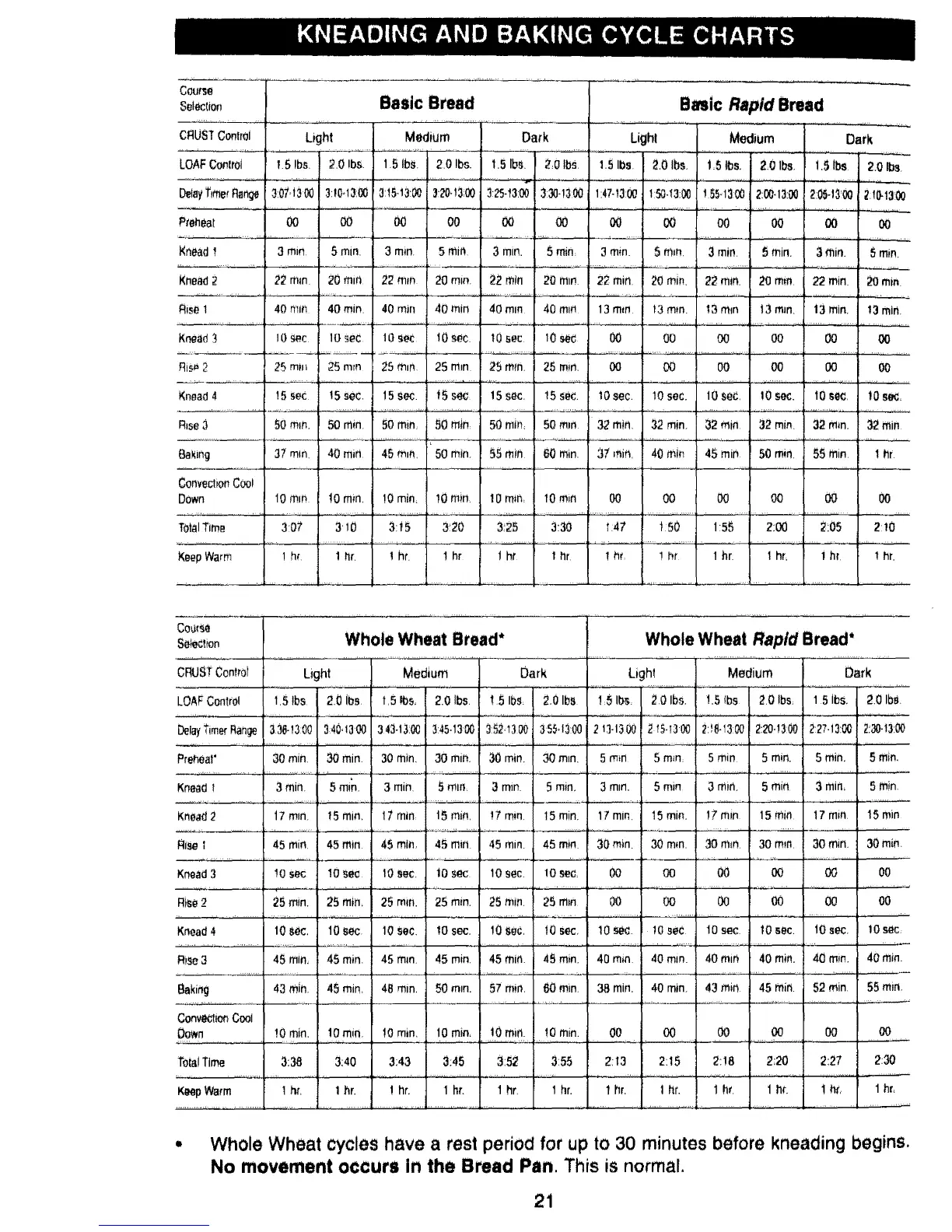• Whole Wheat cycles have a rest period for up to 30 minutes before kneading begins.