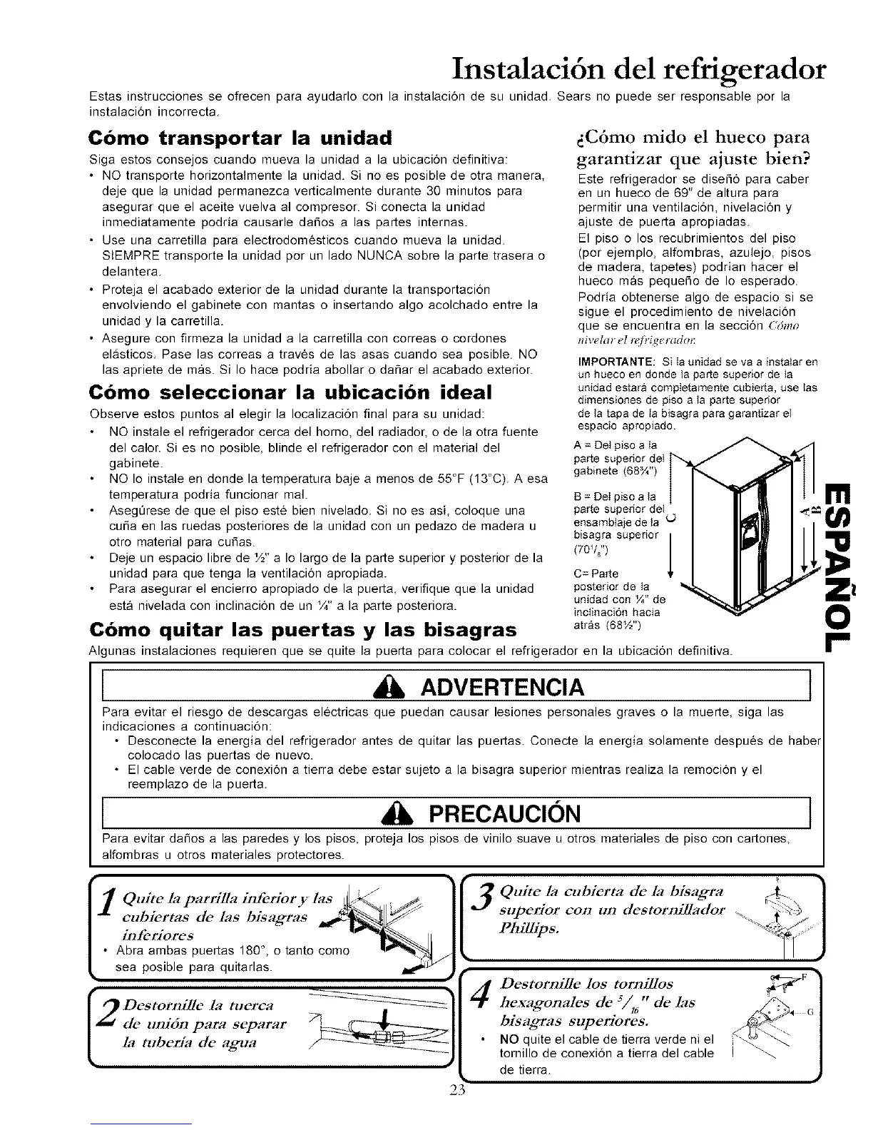 Algunas instalaciones requieren que se quite la puerta para colocar el refrigerador en la ubicacion definitiva.