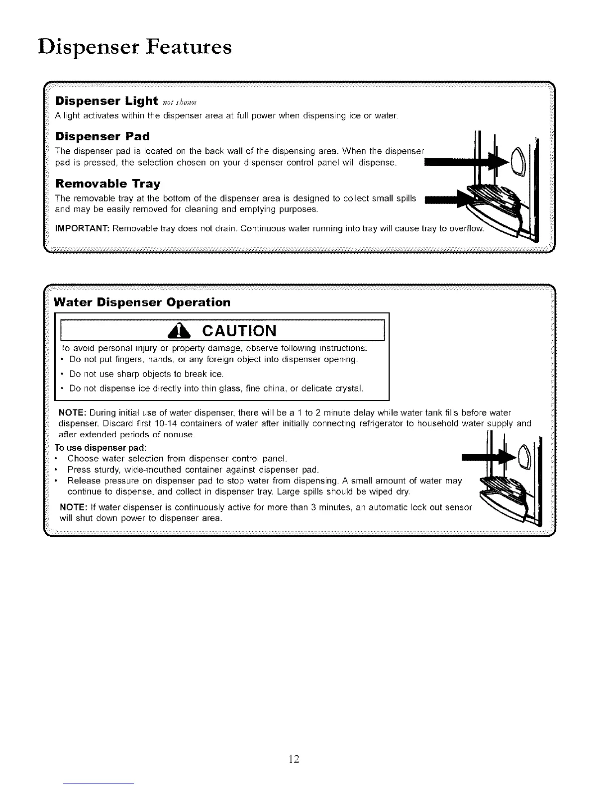 NOTE: During initial use of water dispenser, there will be a 1 to 2 minute delay while water tank fills before water