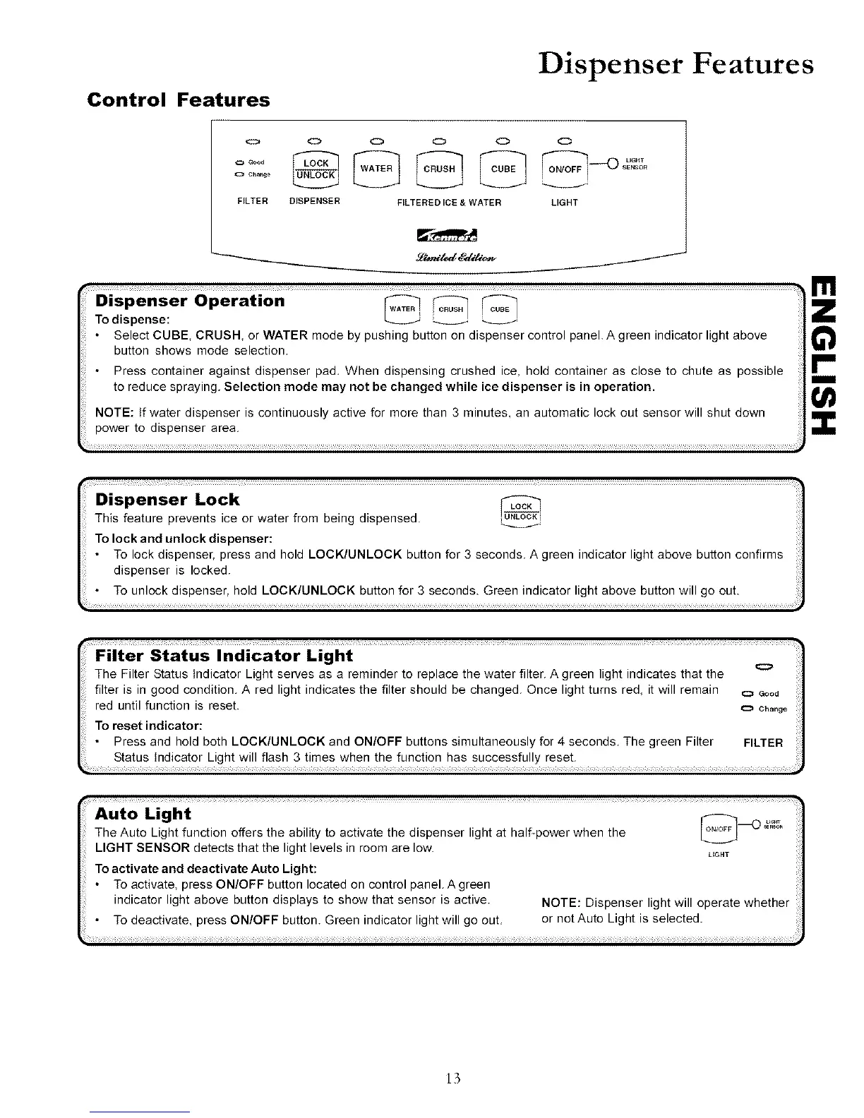 indicator light above button displays to show that sensor is active. NOTE: Dispenser light will operate whether