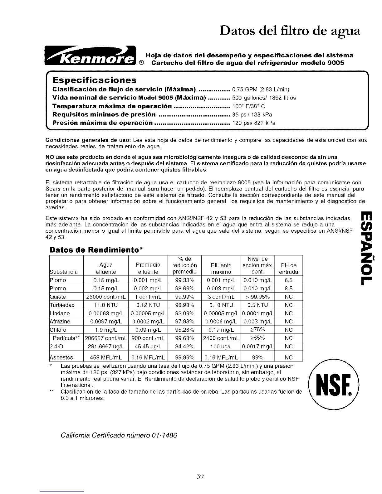 Este sistema ha sido probado en conformidad con ANSI/NSF 42 y 53 para la reducci6n de las substancias indicadas m
