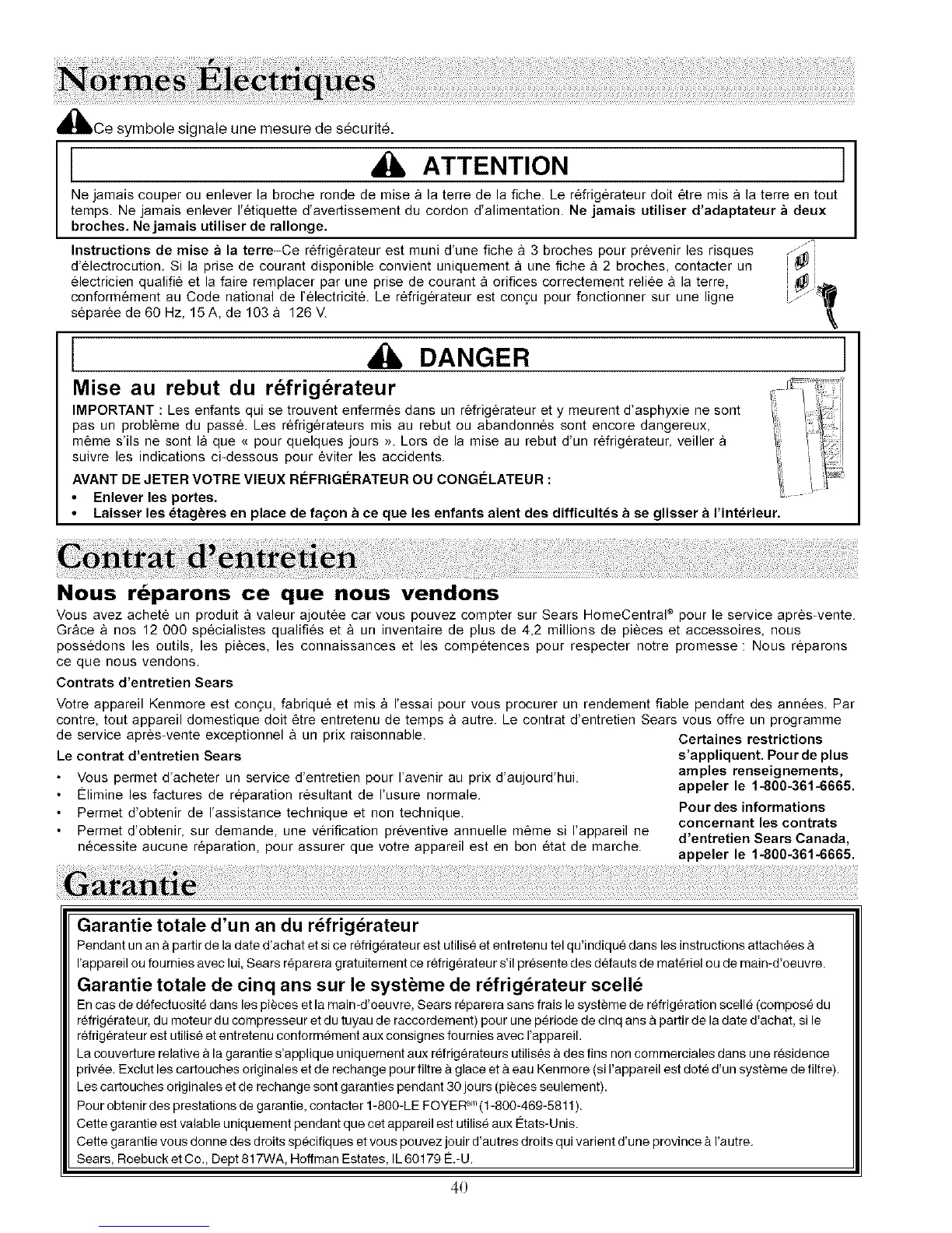 En cas de defectuosite dans les pieces et la main-d'oeuvre, Sears reparera sans frais le systeme de refrigeration scelle (compose du