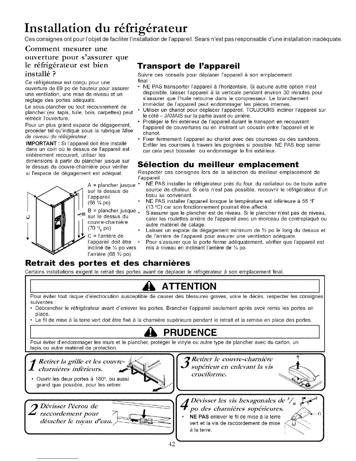 Certains installations exigent le retrait des portes avant de deplacer le refrigerateur a son emplacement final.
