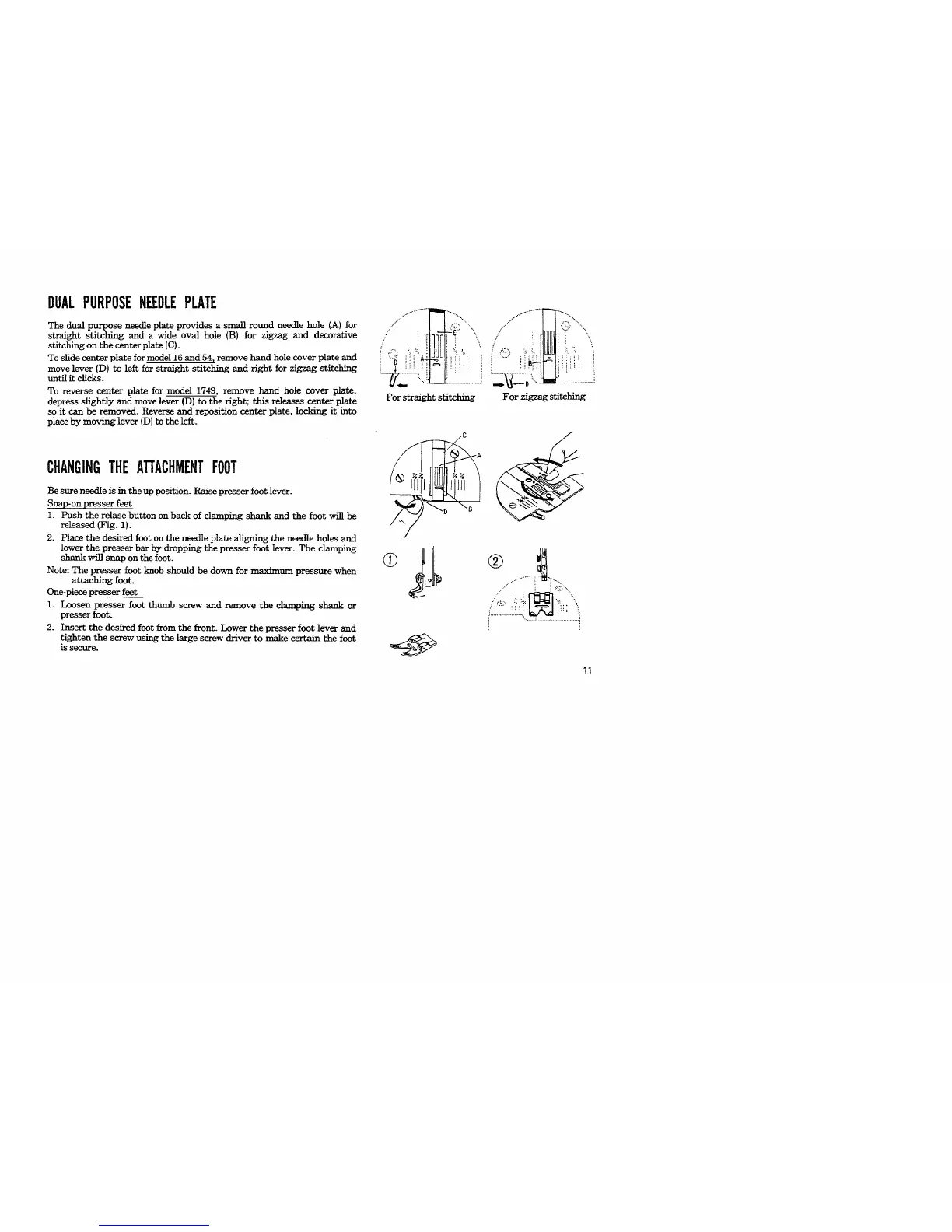 straight stitching and a wide oval hole (B) for zigzag and decorative