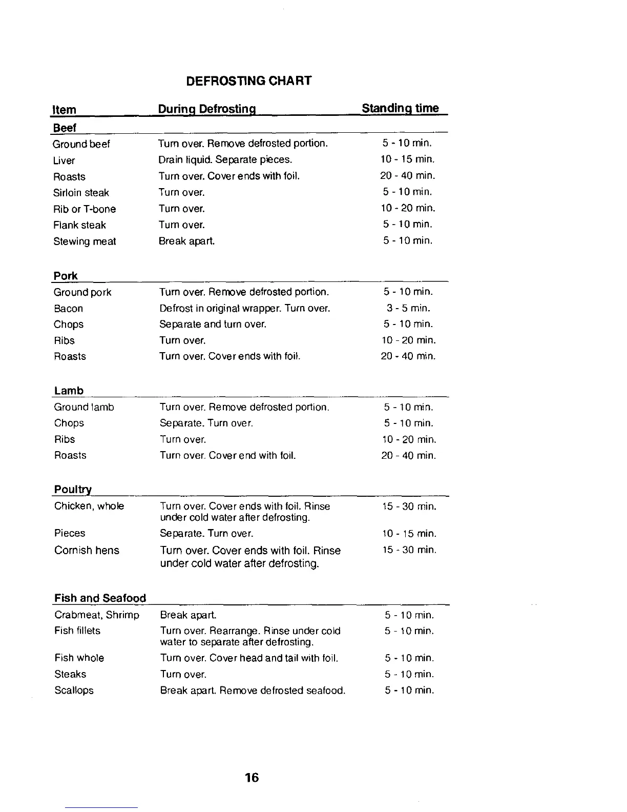 DEFROSTING CHART