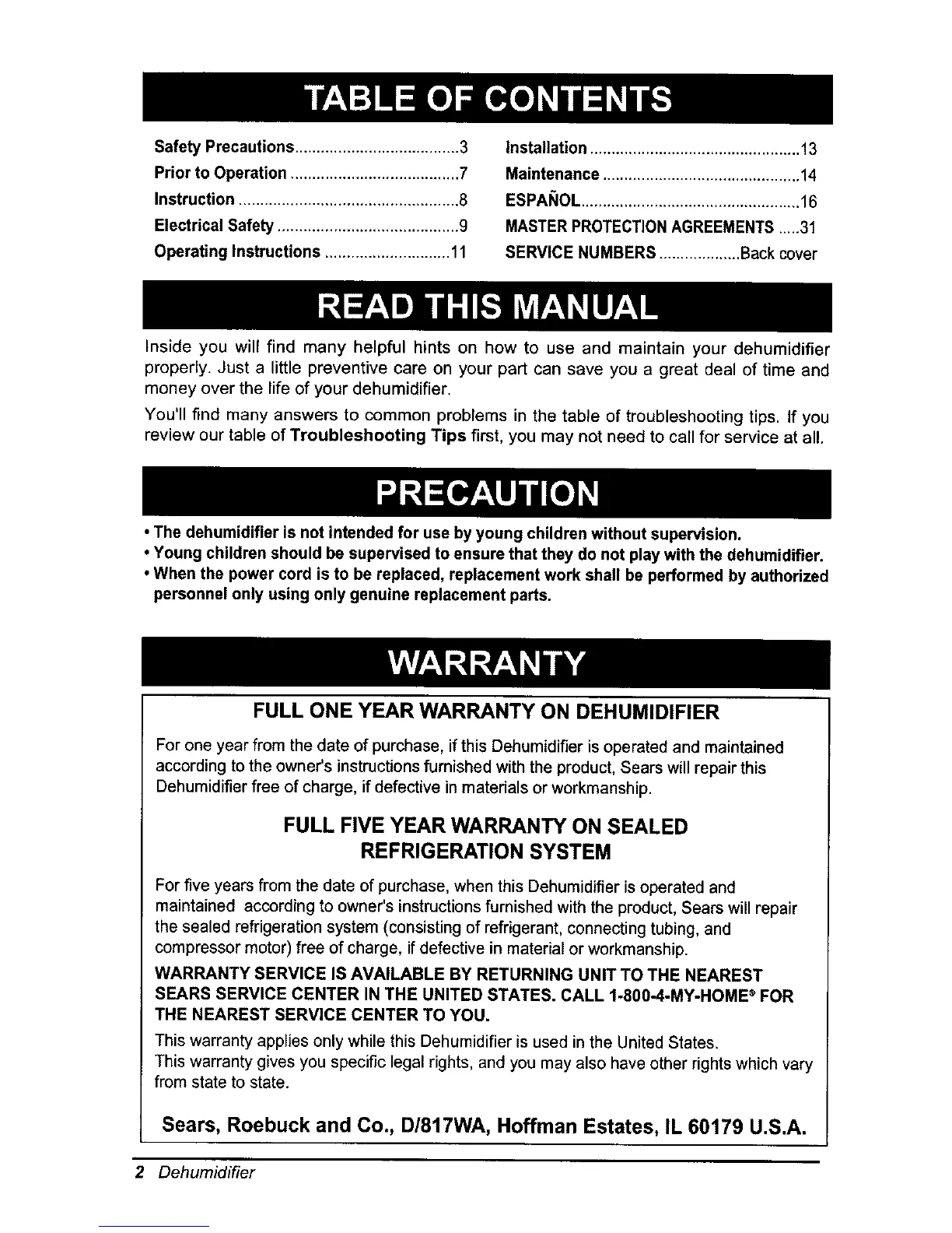 FULL ONE YEAR WARRANTY ON DEHUMIDIFIER