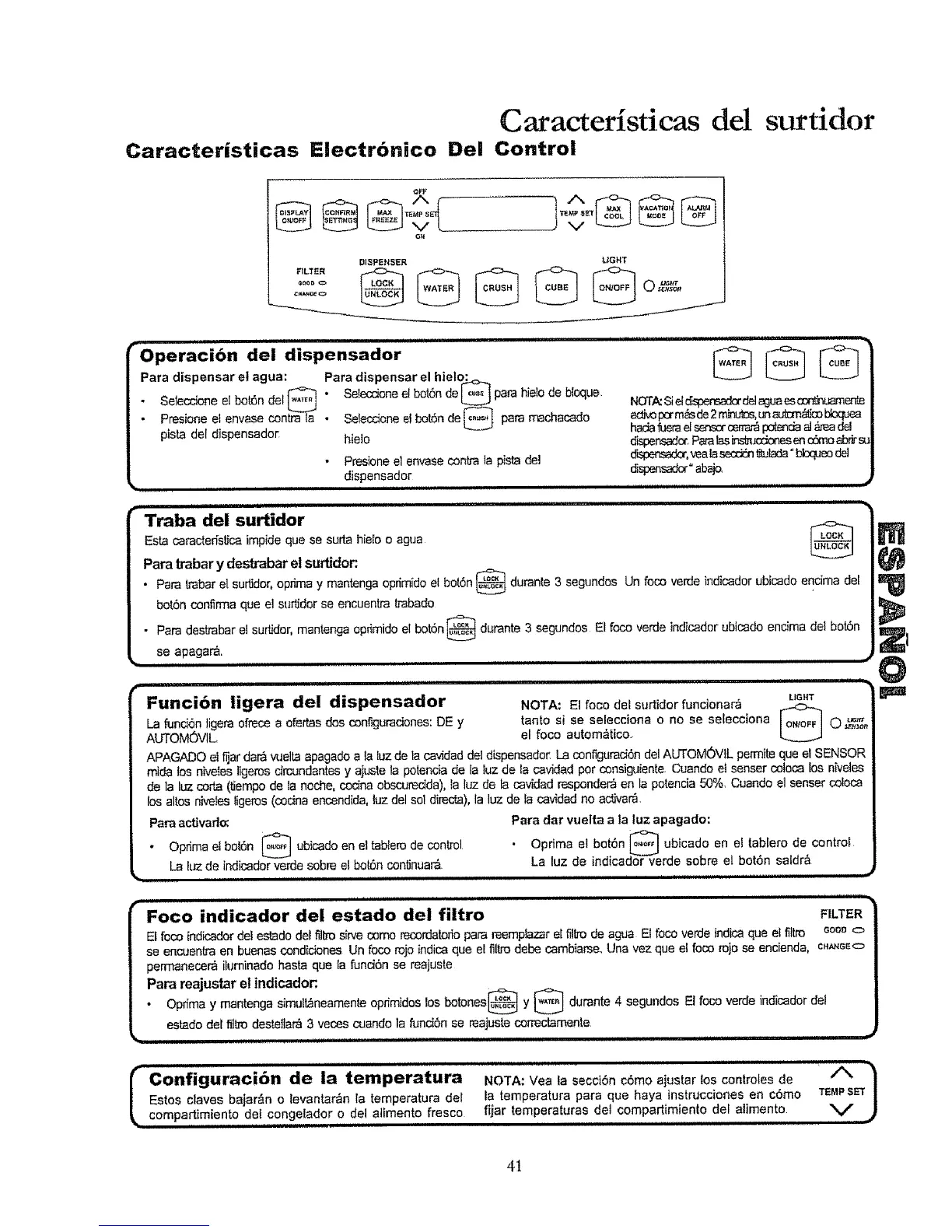 Para dispensar el agua: Para dispensar el hielo_=_._