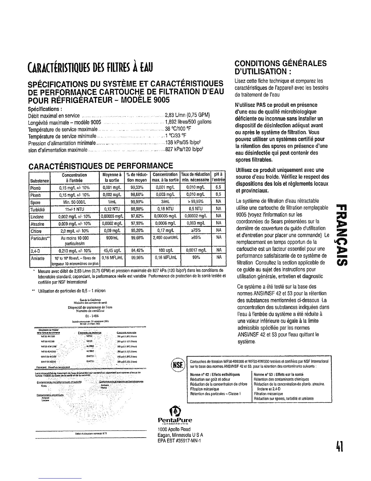 surta basedesnonresANSI/NSF42el 53 pourla r_len_n descon_aminantssuivanLs: