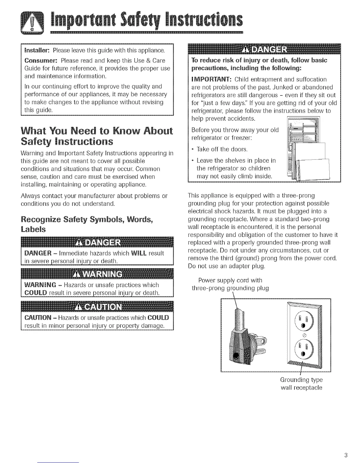 Kenmore 596.76504500 - Important Safety Instructions; Safety Symbols and Hazard Levels