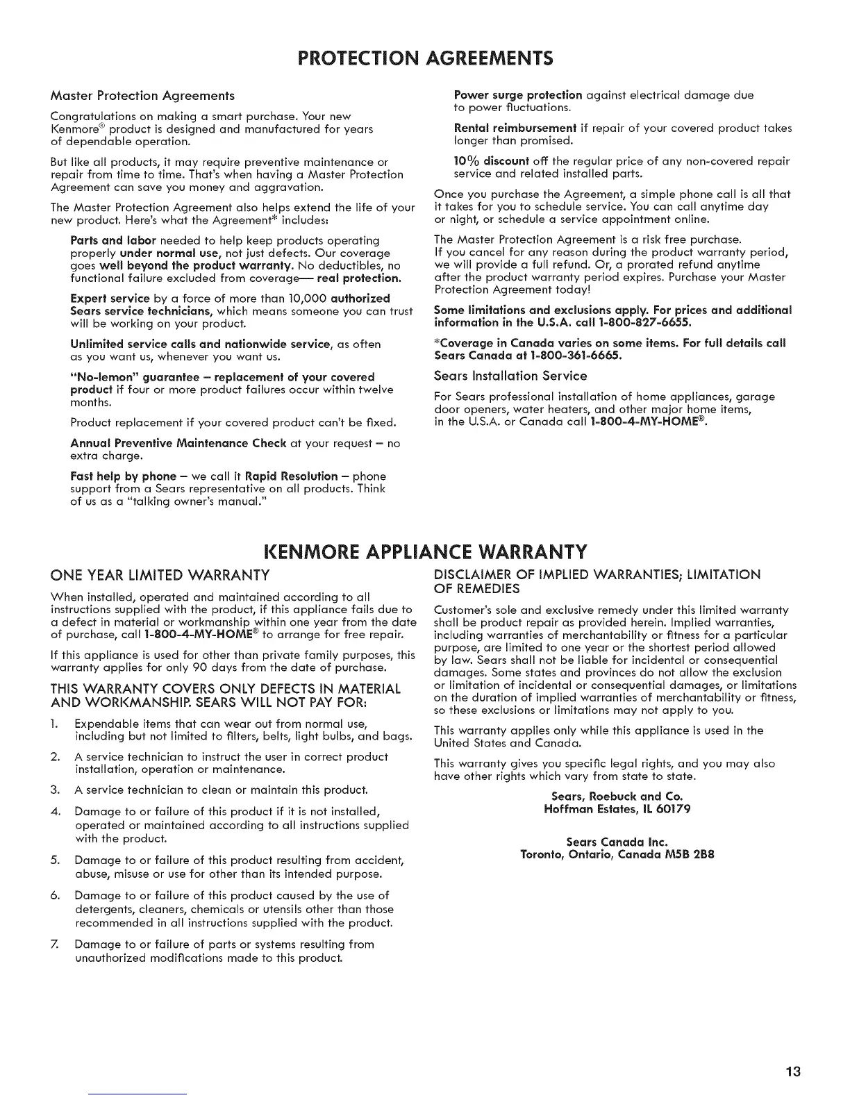 KENMORE APPLIANCE WARRANTY